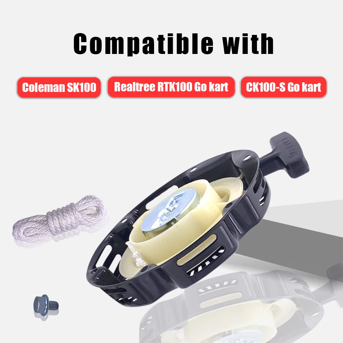 Q: What models of mini bikes and go-karts are compatible with the Pull Start Recoil Starter?A: The Pull Start Recoil Starter is compatible with several models including Coleman CT100U, CC100X Mini Bike, SK100 Go-Kart, as well as models like Coleman SK100, CK100-S Go-Kart, Realtree RTK100 Go-Kart, and others such as the United Power GG1300 and Mitsubishi 154F small engine generators.