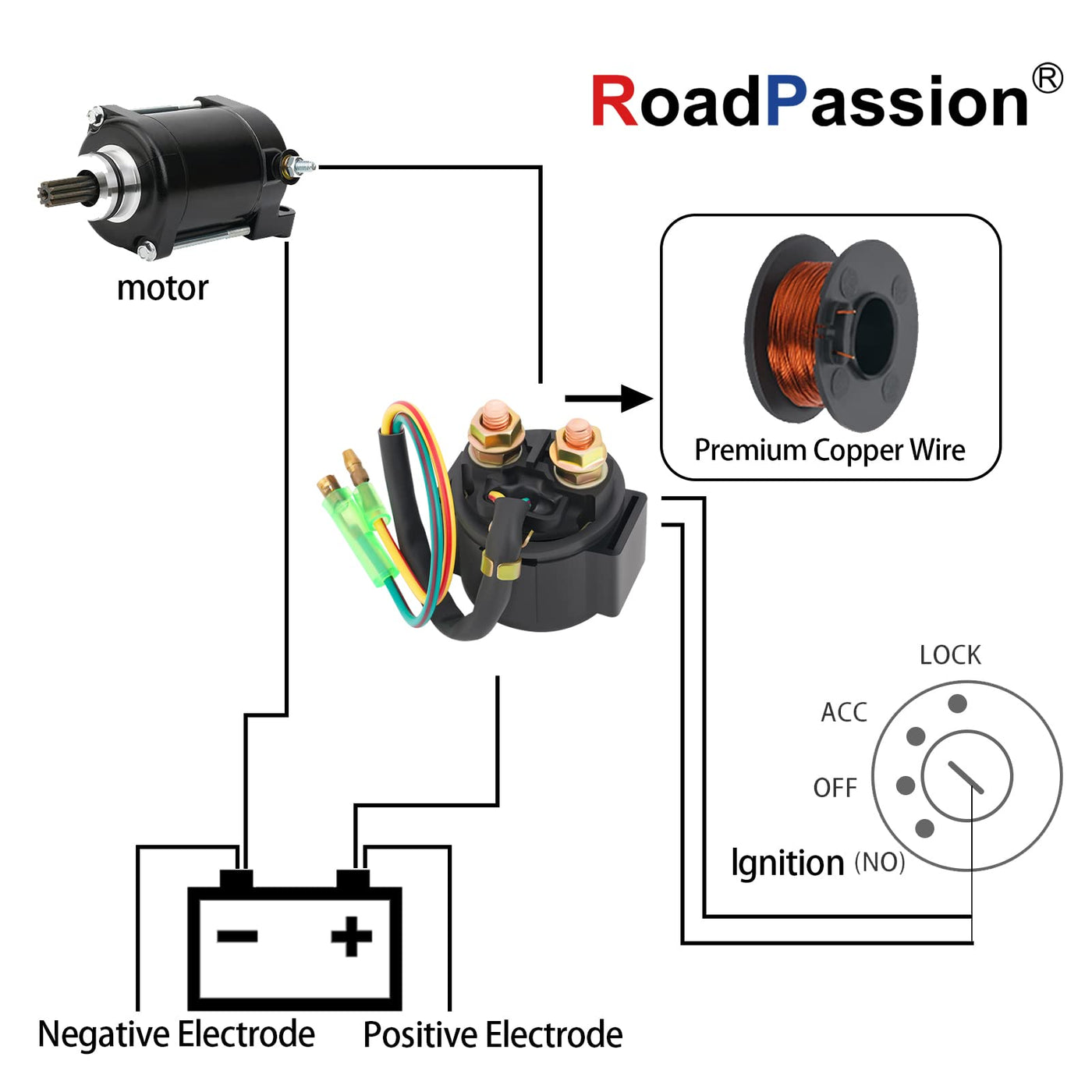 Q: How do I install the starter solenoid relay?A: To install the starter solenoid relay, first ensure the vehicle is powered off. Locate the old solenoid relay, disconnect the wiring, and remove it. Then, connect the new Road Passion Starter Solenoid Relay by attaching the wires according to the original configuration, ensuring a secure fit. Refer to your vehicle's service manual for specific installation instructions.