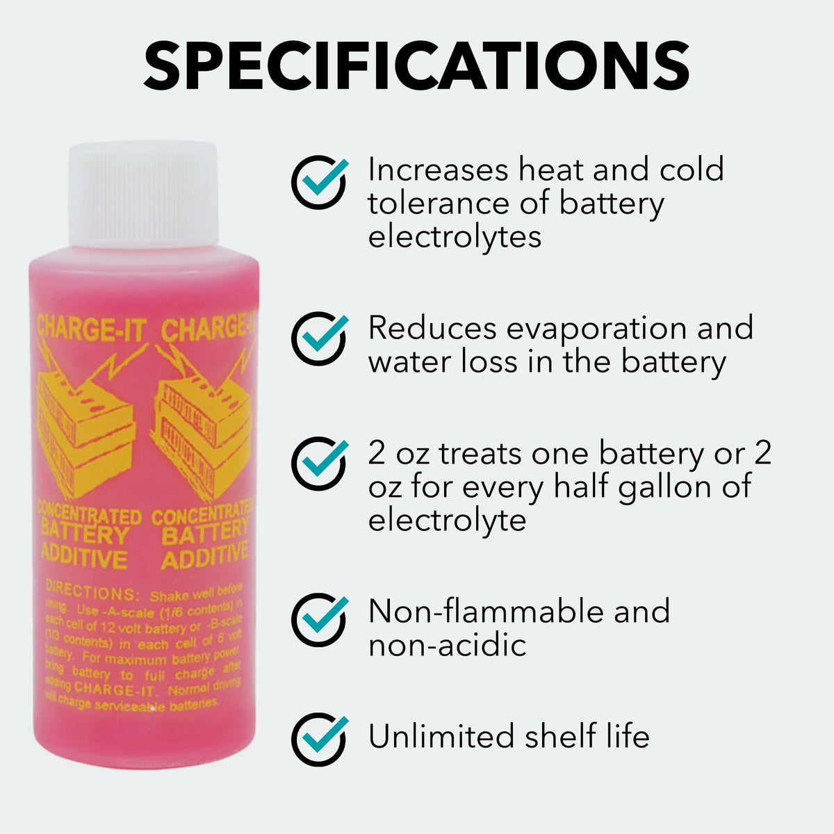 RESTORE WEAK BATTERIES AND EXTEND THEIR LIFESPAN Our Solder-It Charge-It Battery Additive Heavy-Duty Concentrate lets you restore and repower weak batteries within minutes. Special concentrated conductive ingredients break down barriers to the electrolytes. It can even bring mechanically sound dead batteries back to life again. It works by eliminating excessive sulfation on the battery plates. Chemical reactions in your battery naturally produce lead sulfate buildup that hinders the electrolytes. Our reactivator uses special penetrating agents to get rid of harmful sulfate build-up on the battery plates and allow the electrolytes to generate charge again. You get a simple solution that increases electrical energy in your battery. Get faster and easier starts thanks to our battery desulfator. Concentrated ingredients effectively re-energize your battery's electrolytes but they also increase the boiling point and reduce the freezing point of the entire liquid solution. This helps your battery become more effective in climates with extreme hot or cold temperatures. VERSATILE BATTERY FILLER You can use our handy battery maintainer on various battery packs for vehicles. This includes but isn't limited to motorcycle batteries, golf cart batteries, RV batteries, truck batteries, boat batteries, snowmobile batteries, industrial equipment batteries, and much more. This car battery additive can also be stored for years without worry. Its unlimited shelf life means that unused portions will still be as effective as the day you first bought them. Just 2 ounces of this battery reactivator can treat one automotive battery or 2 ounces for every half-gallon of electrolytes. It neutralizes the white, crusty lead sulfates and gets rid of calcium build-ups too! Get your Solder-It Charge-It Battery Additive Heavy-Duty Concentrate today so you can start restoring, improving, and extending the life and performance of your batteries.