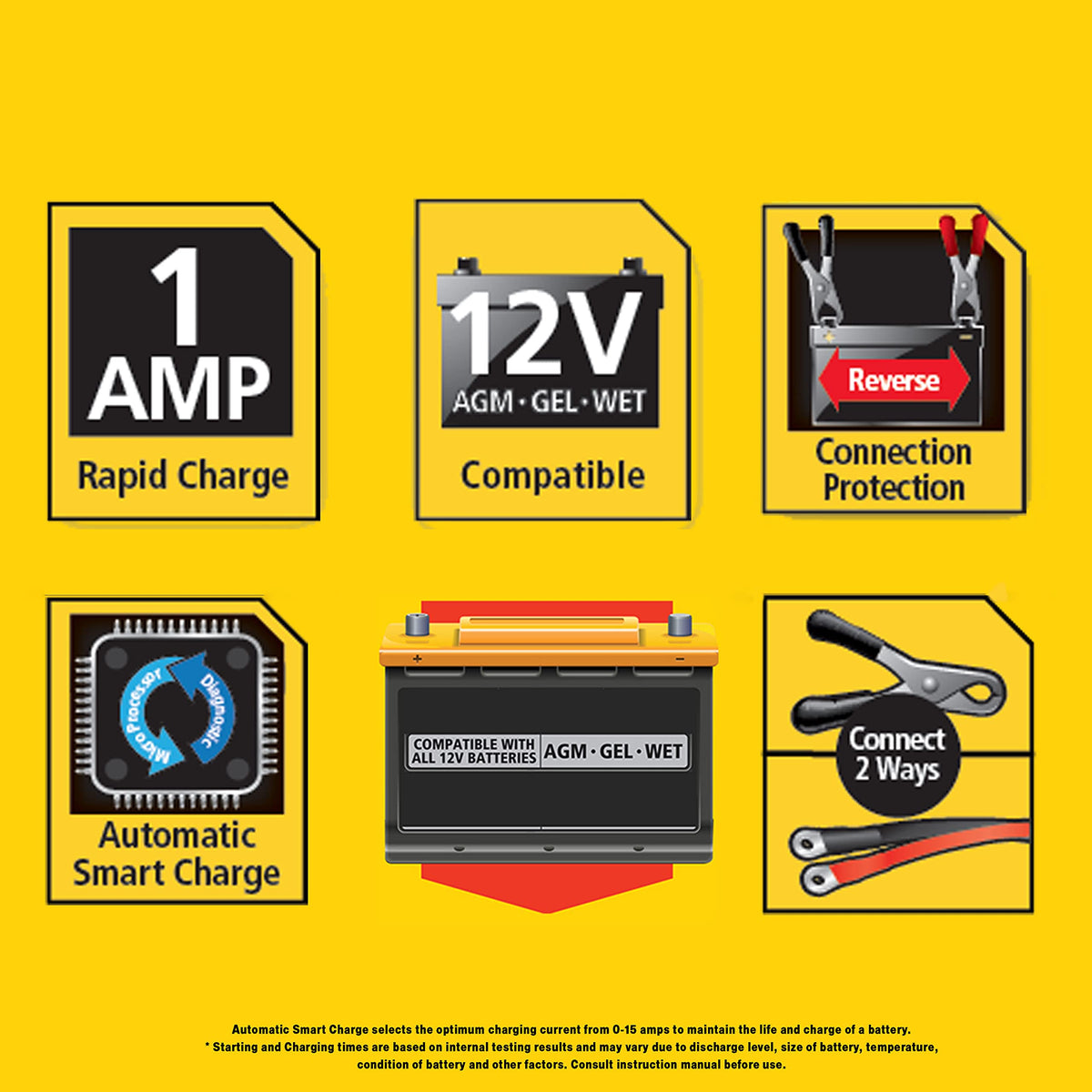 The Stanley Bm1S High Frequency Battery Charger And Maintainer Is Used To Keep Batteries In Stored Vehicles And Battery Applications At Optimal Capacity During The Off Season. With 1 Amp Rapid Charge, Charges 12 Volt Batteries In Most Rvs, Specialty Vehicles, Antique And Classic Cars, Marine Deep Cycle Batteries, Motorcycles, Lawn Mowers, Atvs, Snowmobiles, And Personal Watercrafts. Connect The Battery Charger And Maintainer With The Included Battery Clips Or Battery Ring Terminals. Charging Automatically Stops When Battery Is Fully Charged Or Topped Off And Switches To Float Mode Monitoring To Maintain Charge. Built-In Circuit Protection Guards Against Overcharging, Reverse Polarity, Or Short Circuit. The Stanley Bm1S Battery Charger And Maintainer Is Sealed For Protection Against Moisture, Dust And Oil..