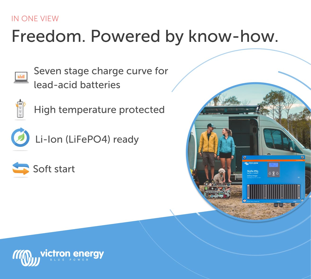 Victron Energy Skylla-Ip65 (1+1) Two Outputs To Charge 2 Battery Banks. Victron Energy Skylla-Ip65 (1+1) Features 2 Isolated Outputs. The Second Output, Limited To Approximately 3 Amp And With A Slightly Lower Output Voltage, Is Intended To Top Up A Starter Battery.