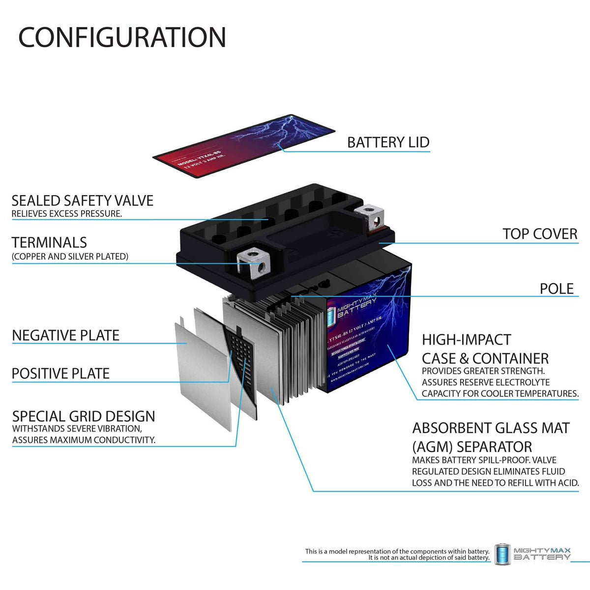 Q: What are the key specifications of the Mighty Max YTX4L-BS battery?A: The Mighty Max YTX4L-BS battery has a voltage of 12 volts and an amperage of 3 AH. It features a sealed lead-acid (SLA) absorbed glass mat (AGM) design, ensuring maintenance-free use. Additionally, it provides 50 cold cranking amps (CCA) and weighs 2.93 lbs.