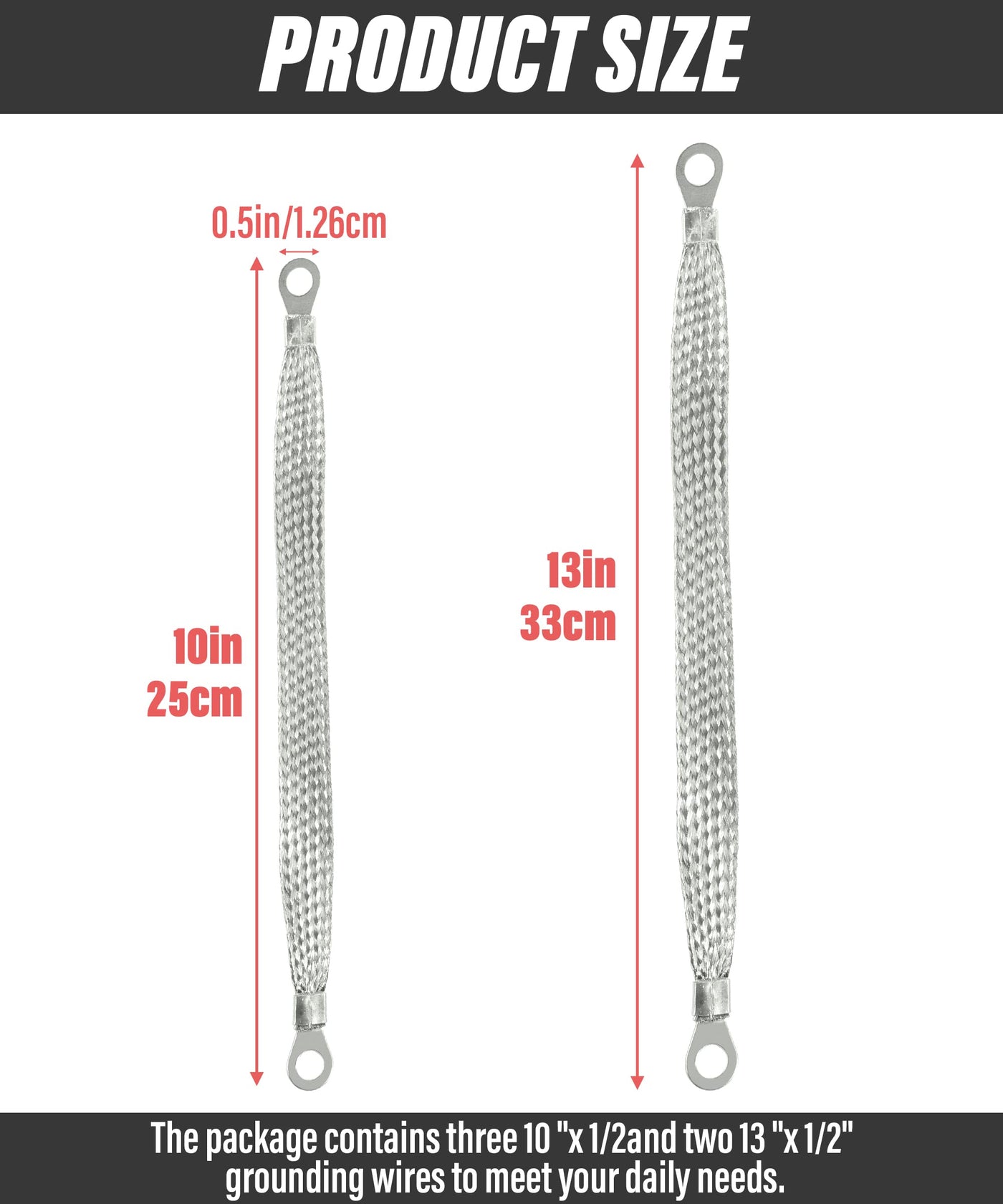 Zlirfy Automotive Ground Strap Kit,Universal Flat Braided Copper Ground Strap,3Pcs 10' X 1/2' And 2Pcs 13' X 1/2' Car Ground Cable Straps Braided,Automotive Engine Copper Ground Strap