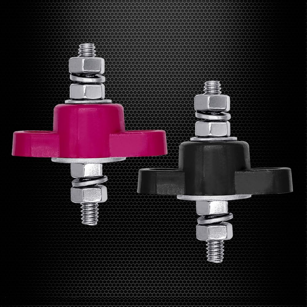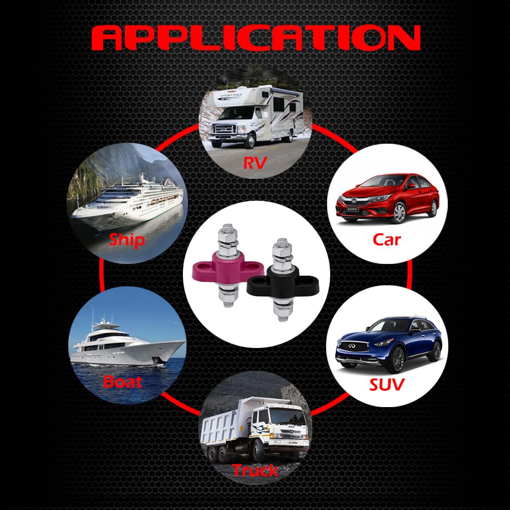 Ampper 1/4'' Remote Battery Terminal Feed Through Connector Used As Junction Post Block Power Connect Terminals Specifications: 1, 1/4'' Remote Battery Terminal Feed Through Connector Used To Pass High-Current Power Through A Solid Surface Instead Of Large Cables. 2, Connect Two Or More Connectors / Wires. 3, Very Useful For Customizing Or Relocating Battery And Wire. 4, Mounts Through Panels Up To 0.45'' Thick. 5, Install With Screw Mounting Holes For Any Orientation Installation. 6, 150 A Continuous At Dc 12V, Fit For Max Up To Dc 48V Feed Through Panel Power / Ground Stud Terminal Application. 7, Nylon Construction With Stainless Steel Stud And Hardware For Strength And Durability. 8, Perfect For Passing High Current Cables Through Panel. 9, This Feed-Thru Stud Terminal Also As Battery Junction Post Block For Battery Power And Ground Distribution. 10, For Car, Vehicle, Rv, Boat, Marine Battery Accessories Connections, Also Electrical Equipment And Solar Cells Etc.. Complete Kits Includes: 1 Pair Remote Feed Through Connector With Nuts. 1 Pair Silicone Stud Terminal Covers.