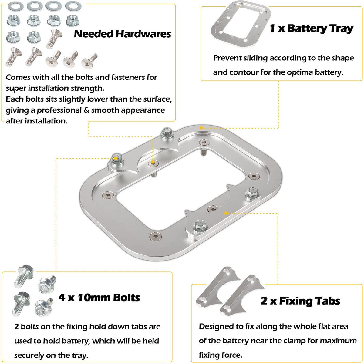 Q: How do I install the battery tray?A: Installation is straightforward with the included hardware. The package comes with 6 nuts, 6 bolts (8mm), 4 bolts (10mm), 4 bolt washers, 2 fixing hold-down tabs, and the battery tray itself. Ensure you follow the installation guidelines for a secure and proper fit.