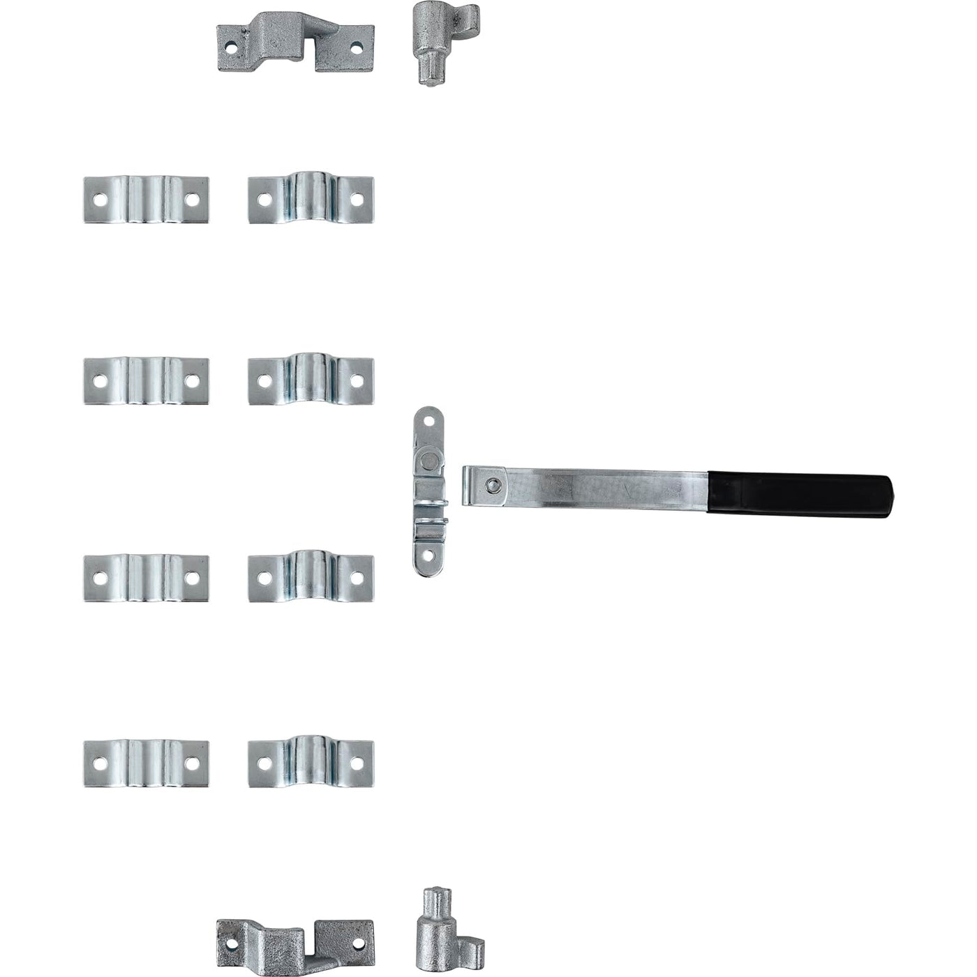 Buyers Products Trailer Door Cam Action Lock Kit features rugged cast steel cups, lugs, a 13 in. steel handle, and supports. It is for use with a 3/4 in. pipe (not included). All metal components feature a clear zinc finish for enhanced corrosion resistance.