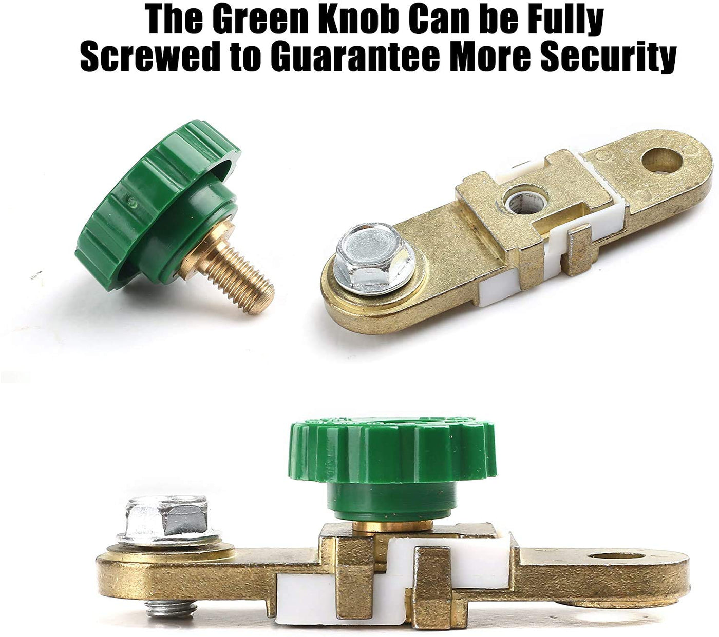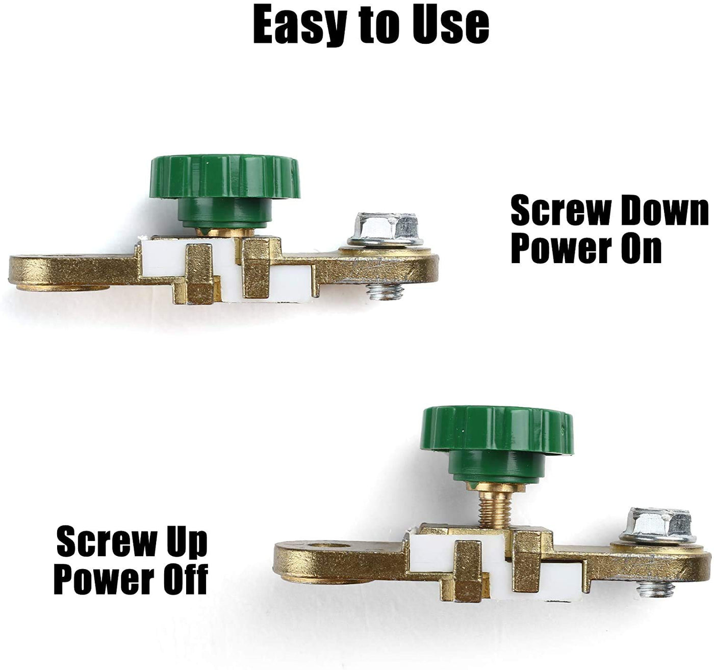 Color: Green & Copper Inner diameter: 17.5mm Cable size: 4-6 AWG Package Includes: 1x Car Battery Terminal Switch Our patented Side Post Battery Disconnect switch is designed to be used with General Motors style batteries with the connections on the side. A simple twist of a knob provides a convenient way to quickly disconnect and reconnect power from an automotive battery. This switch provides a clean, solid, low profile connection to GM side post batteries. The switch makes it simple to disconnect your battery to work on your vehicle or the knob can be removed to prevent theft. It also works great to eliminate battery drain if youre storing a vehicle for an extended period of time. This switch can be used as an in-line device on the negative side of the battery to break the ground connection. This works well on motorcycles and vehicles that do not use conventional car batteries. Side Post Battery Disconnect Switch Easy Installation Instructions 1. Remove negative cable from battery 2. Using the included bolt,attach switch to negative battery post3. Screw battery cable into threaded hole in switch 4. Completed installation,keep connections. Clean & tight to assure optimum performance