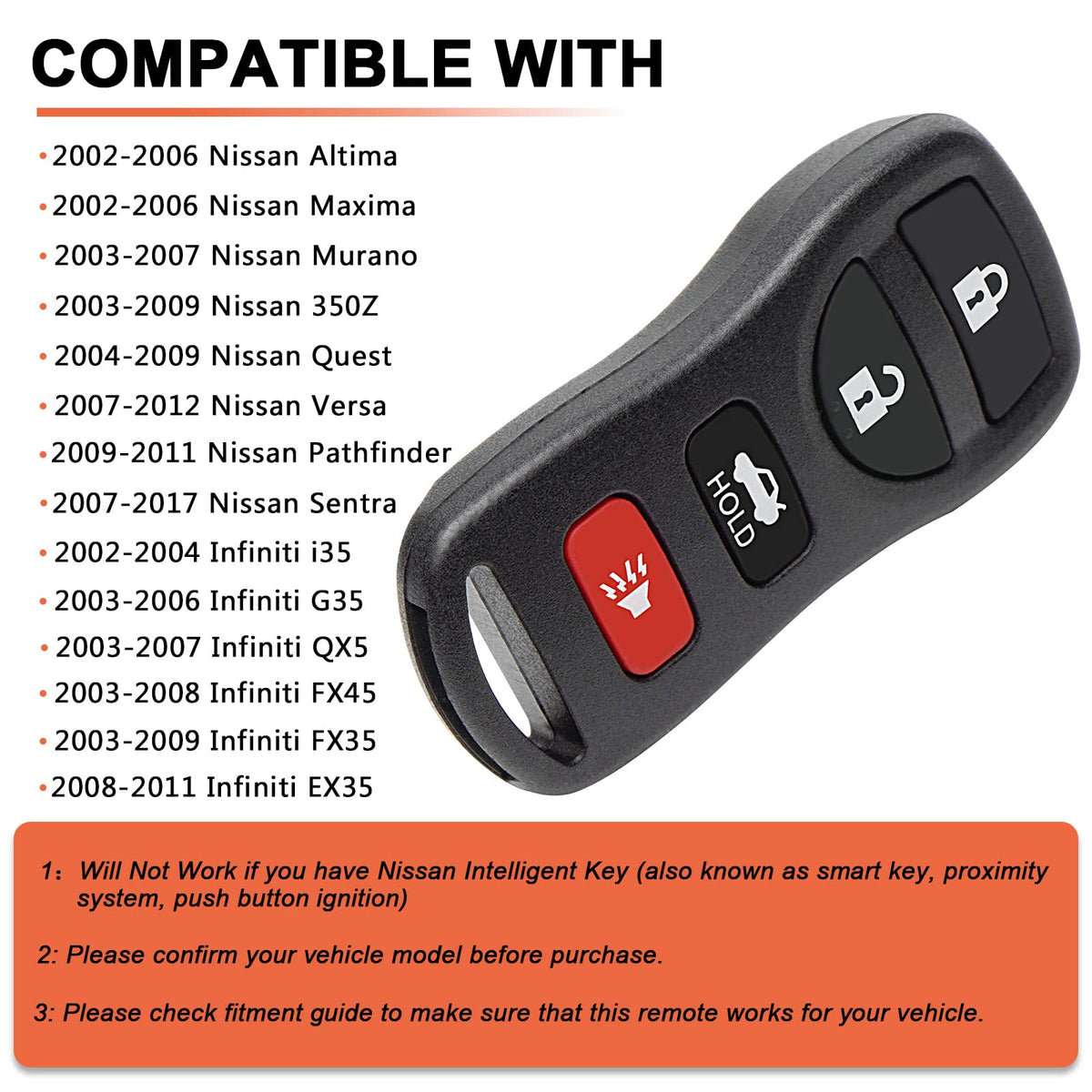 SaverRemotes is a professional keyless entry remote replacement supplier. Please feel free to use the SaverRemotes key fob to replace your lost or damaged keyless entry remote.Features:1: FCC ID: KBRASTU15, CWTWB1U758, CWTWB1U733, CWTWB1U821, CWTWB1U751.2: Part Numbers: 28268-ZT03A, 28268-EA000, 28268-EA00A, 28268-ZE10B, 28268-ZB700, 28268-C991A, 28268-C991C, 28268-5Y701.3: High Quality: Each car key replacement comes complete with batteries and has been pre-tested to ensure quality and functionality.Warranty: 2-YEAR.Note: If you are not satisfied with your purchase, simply take advantage of our no questions asked, 30 day money back guarantee.Note: If you do not have working key, remote needed to be programmed by dealer or locksmith.Compatibility:For 2003-2009 Nissan 350ZFor 2002-2006 Nissan AltimaFor 2004-2015 Nissan ArmadaFor 2002-2006 Nissan Maxima For 2003-2007 Nissan MuranoFor 2009-2011 Nissan PathfinderFor 2007-2017 Nissan SentraFor 2007-2015 Nissan VersaFor 2004-2009 Nissan QuestFor 2008-2011 Infiniti EX35For 2003-2009 Infiniti FX35For 2003-2008 Infiniti FX45For 2003-2006 Infiniti G35For 2002-2004 Infiniti i35For 2003-2007 Infiniti QX56NOTE:Will not work if you have Nissan Intelligent Key (also known as smart key, proximity system, push button ignition).Programming Instruction:You can find the car key programming method by entering the vehicle model and year in the following website:Infiniti: www.keyfobprogram.com/category/infinitiNissan: www.keyfobprogram.com/category/nissanNote:Please check the compatibility before your purchase, make sure it is exactly what you need.