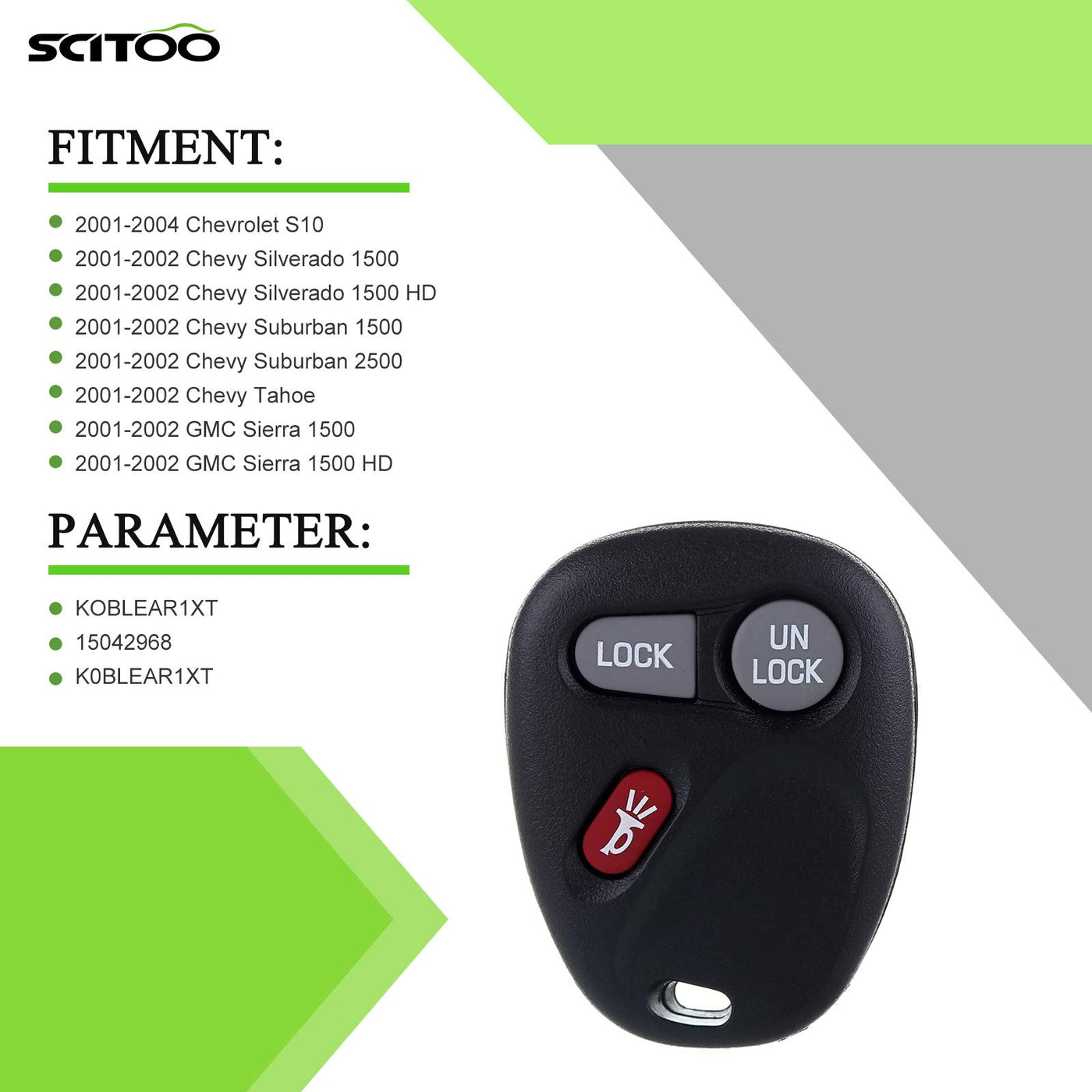 Q: What vehicles are compatible with the SCITOO Key Fob?A: The SCITOO Key Fob is compatible with various Chevy and GMC models from 2001 to 2004, including Chevy S10, Silverado 1500, Silverado 1500 HD, Suburban 1500, Suburban 2500, Tahoe, GMC Sierra 1500, Sierra 1500 HD, Sonoma, and Yukon. Please refer to the compatibility chart to ensure it fits your specific vehicle.