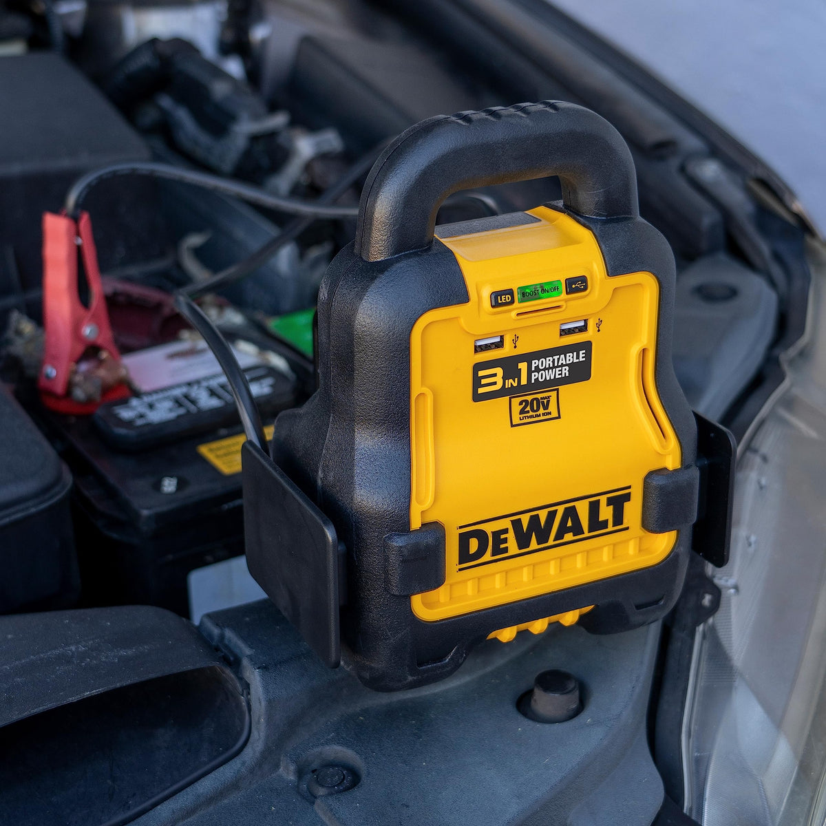 Jump start your vehicle battery using the included DeWalt 20 volt lithium battery pack or one of your own. The DeWalt DXAE20VBBK Battery Booster Jump Starter aids in starting vehicles and charging personal electronics. USB ports make it easy to power laptops, cell phones, tablets gaming devices and most USB powered devices. Also works with the DeWalt FlexVolt battery on the 20V setting.