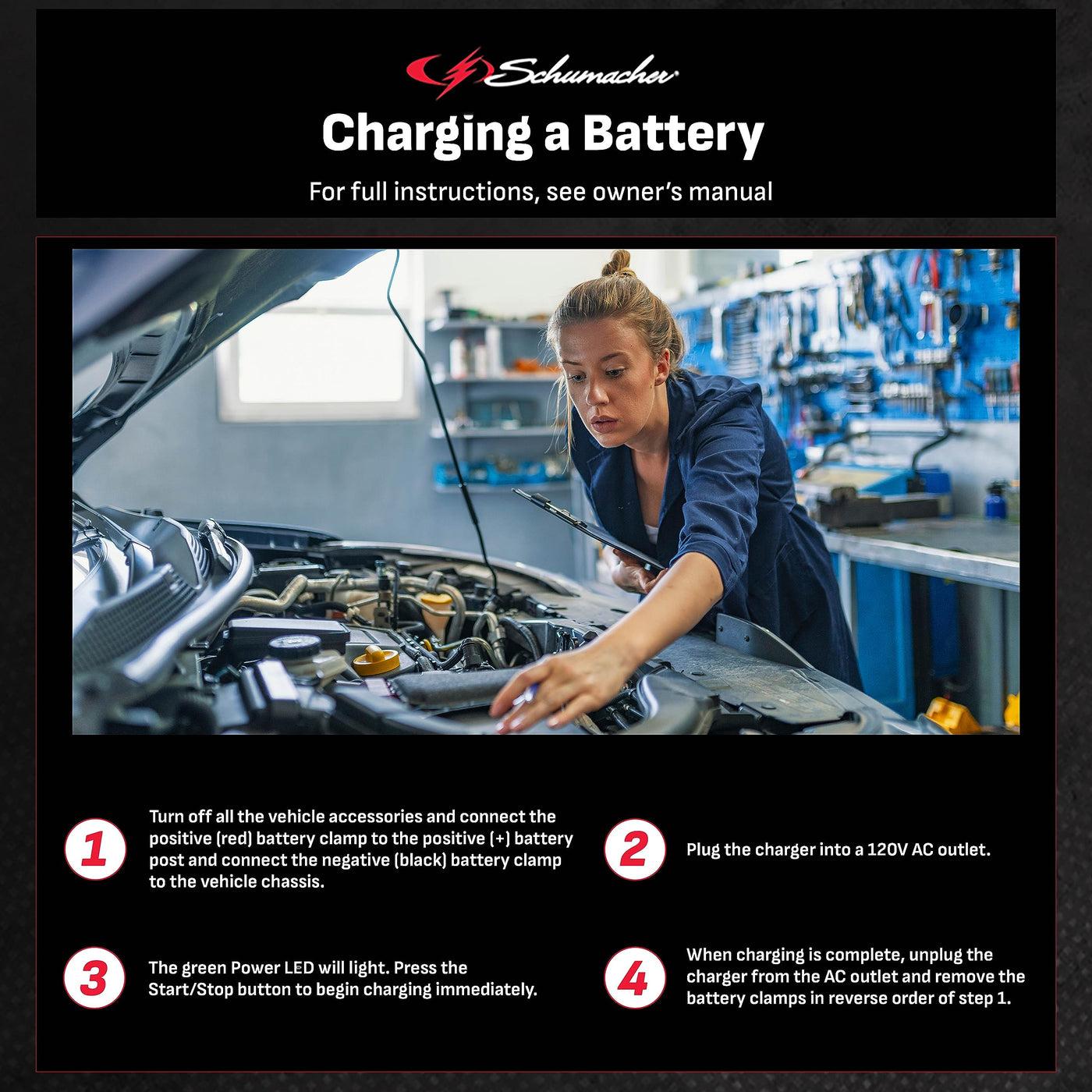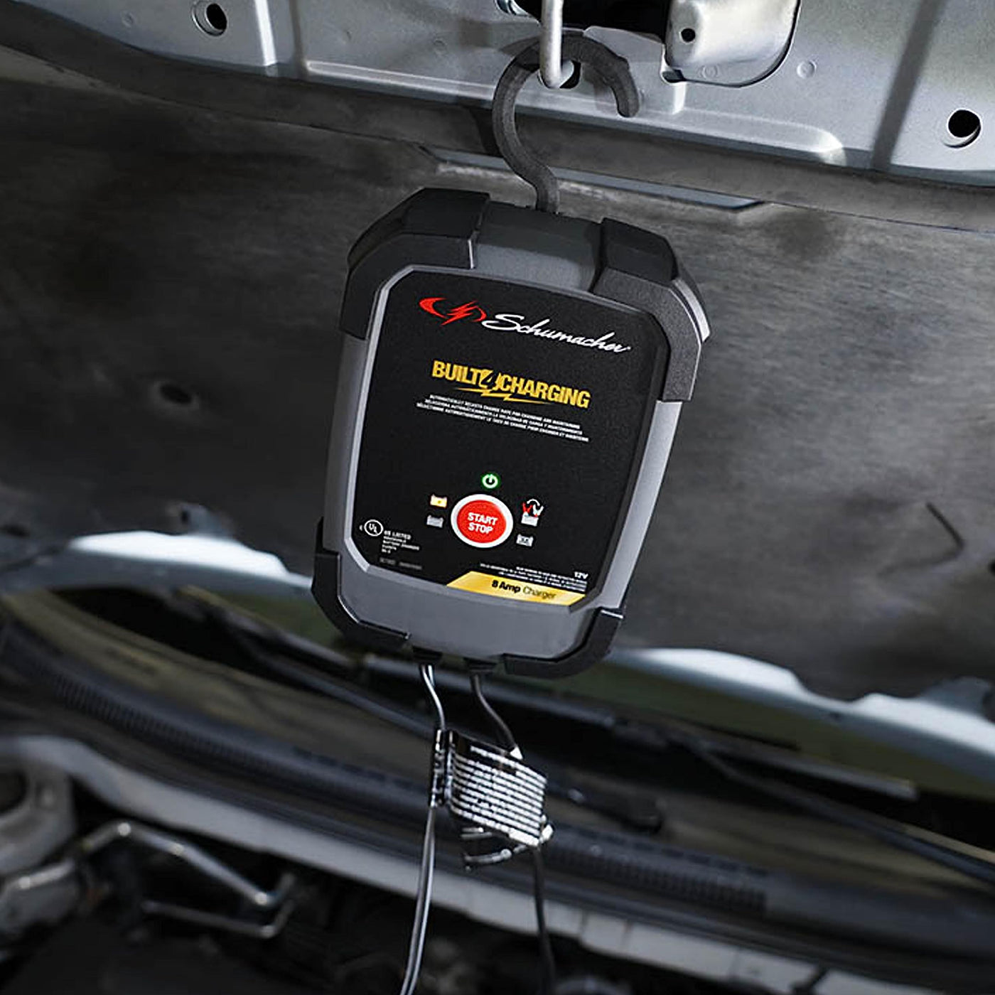 The Schumacher SC1302 Battery Charger and Maintainer is a great option for general charging applications. The microprocessor automatically adjusts the amperage rate, with multi-stage charging to extend battery life. Includes a hanging hook attachment, simple start/stop interface, LED indicator lights for charge status tracking, and reverse hook-up protection which prevents the charger from operating if the clamps are reversed. Schu Eco Energy meets the highest industry standards. Compatible with standard and AGM batteries.