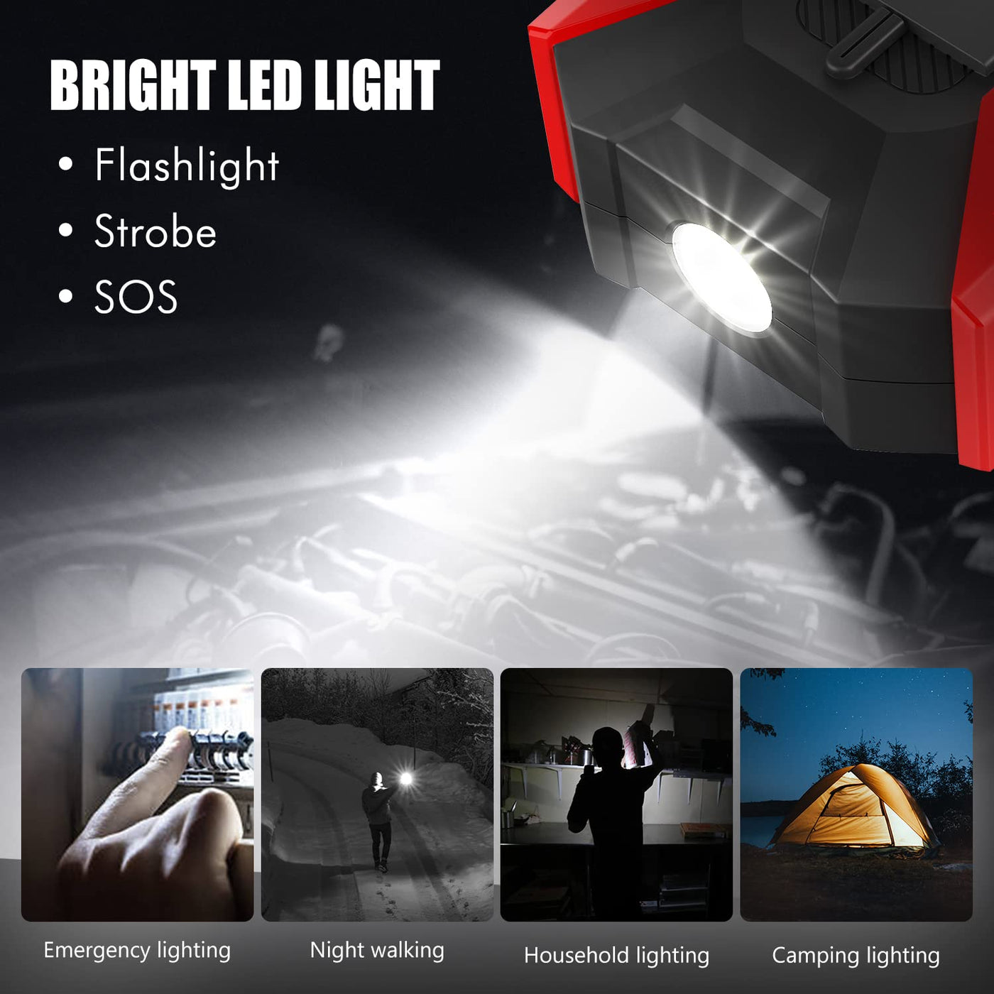 Q: How does the LED emergency light function on this jump starter?A: The built-in LED emergency light on the DNA MOTORING TOOLS-00214 features three modes: strong light, flash, and SOS. This versatility allows users to illuminate dark areas or signal for help in emergency situations.
