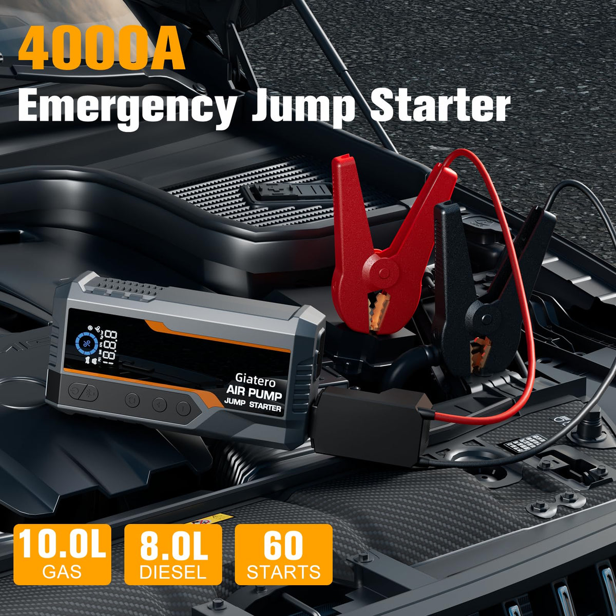 Giatero Jump Starter with Air Compressor, 4000A 150PSI Car Battery Jump Starter Portable (All Gas/10.0L Diesel), 12V Jump Box Ba