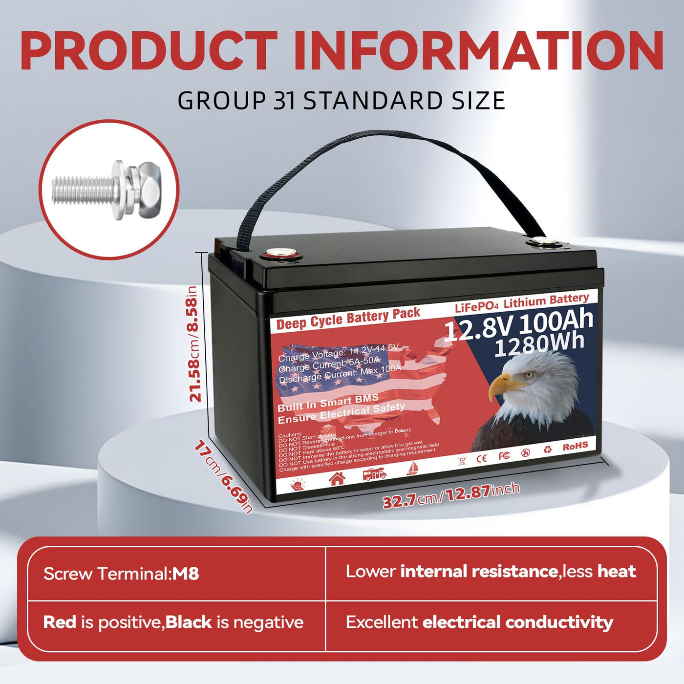 12V 100Ah LiFePO4 Lithium Battery Group 31 1280Wh Upgraded Low-Temp Protection LiFePO4 Battery, Built-in 100A Smart BMS, 8000+ C