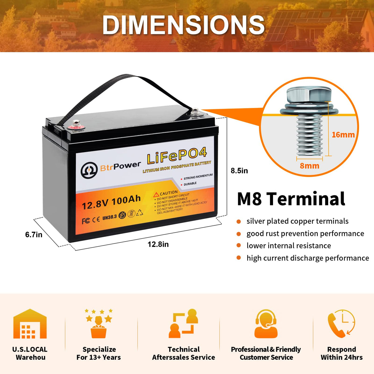 Why Choose BtrPower3-5 business days receive it after you orderYou can get the best serve. we can solve your problems with 24 hours.One year war ranty and 3*months free return or replacementKey FeaturesLonger service life. its service life can up to 10 years, lead-acid's service life only 3 yearsLightweight. its weight is only 1/3 the weight of lead acid batteriesMore Charge Cycles LiFePO4 battery's charge cycle is about 7000+ cycles.More stable and Safer. the chemical of LiFePO4 battery is very stable. so it's very safer than lead acid battery Battery SpecificationsRated Capacity : 100Ah / 200AhNominal Voltage: 12.8vVoltage Range: 10~14.6 VCut-off Voltage: 10vDimensions (L x W x H): 12.8 x 6.7 x 8.4 Inch- 100ah / (L x W x H): 19.5 x 9.3 x 8.6 Inch - 200ahWeight: 24lbs (100ah) / 47lbs (200ah)Maximum Continuous Charging Current: 100AMaximum Continuous Discharging Current: 100AMaximum Permanent Discharging Current: 200A 5Sec.Operating Temperature: Charge: 0C--50C; Discharge: -20C--60C