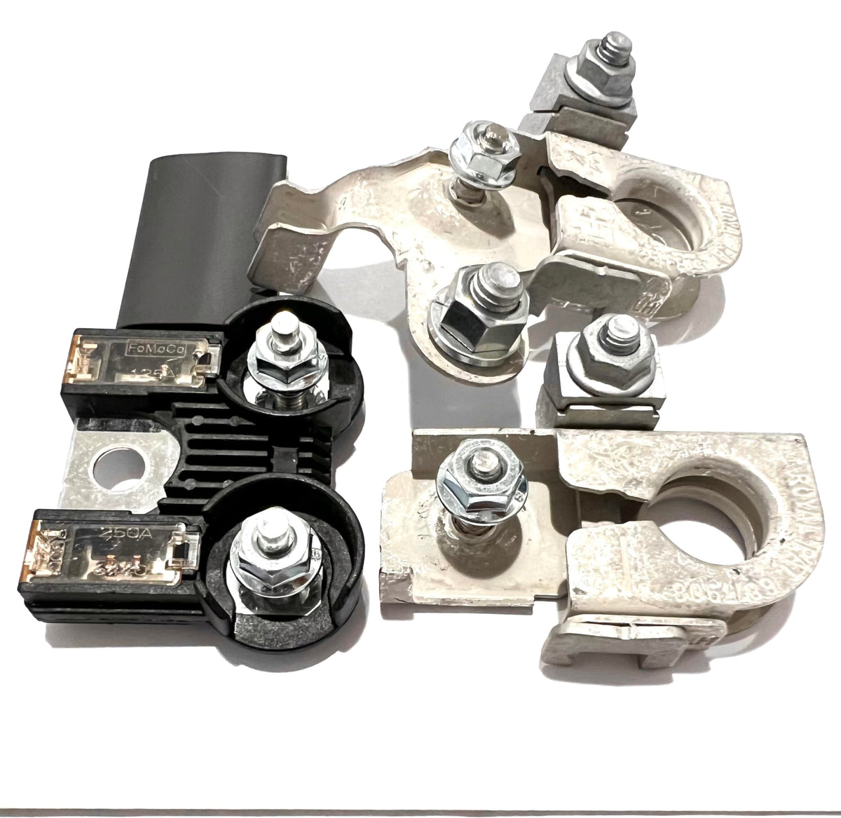 The AL3Z-14526-AA heavy-duty battery fuse link is specifically designed for Ford F-150 (2011-2014), F-250 (2011-2014) pick up trucks, and also a compatible fit for Lobo and Mark LT models. The dual-rated 250 Amp / 125 Amp fuse comes complete with installation hardware, including both BT4Z-14450-AA & BT4Z-14450-BA 6mm nuts and one 8mm lock nut & heat shrink for secure mounting. This direct-fit replacement part serves as a crucial component for your vehicle's electrical system, protecting the alternator and starter from potential damage. The robust construction features a single bus bar with both integrated fuses built into a durable plastic housing built to withstand demanding automotive conditions. Installation is straightforward, making it an ideal solution for replacing blown or corroded battery fuse terminals. The installation takes less than 5 minutes. The part number AL3Z14526AA / AL3T-14A094-AA ensures exact fitment for the specified vehicle applications, maintaining proper electrical system functionality. Built in Mexico, this fuse link matches the original equipment specifications for reliable performance in your Ford truck's electrical system.