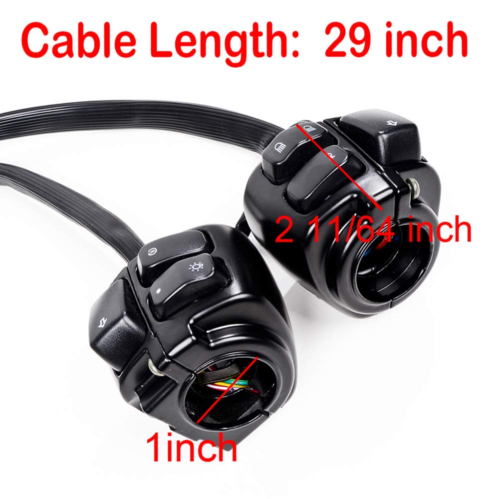 Specifications: Condition: 100% Brand New Package Includes: 2X Motorcycle Handlebar Headlight Horn Turn Signal Light Switch With Harness Diameter: Of Hole: 1'' (25Mm) Cable Length: 29'' (73Cm) Color: Black Housing, Black Button Voltage: Dc 12V Material: Aluminum Housing, Plastic Button Weight: 550G Features: Aftermarket Headlight High/Low Beam Horn Turn Signal Light On/Off Switch Compact Size. All-In-1 Design. Built In Switch Control. Left Side: Switch For Horn, High/Low Beam Headlight & Left Turn Signal Right Side: Switch For Kill, Ignition Start & Right Turn Signal Not Interfere With Clutch. Easy Installation. Easy Access & Comfortable Control. Please Check The Measurement For Your Handlebar To Make Sure It Fits For Your Application. Please Check The Connector (As The Image Shown) To Make Sure It Fit Perfectly With Your Oem Connector, Minor Modification May Need For Some Models