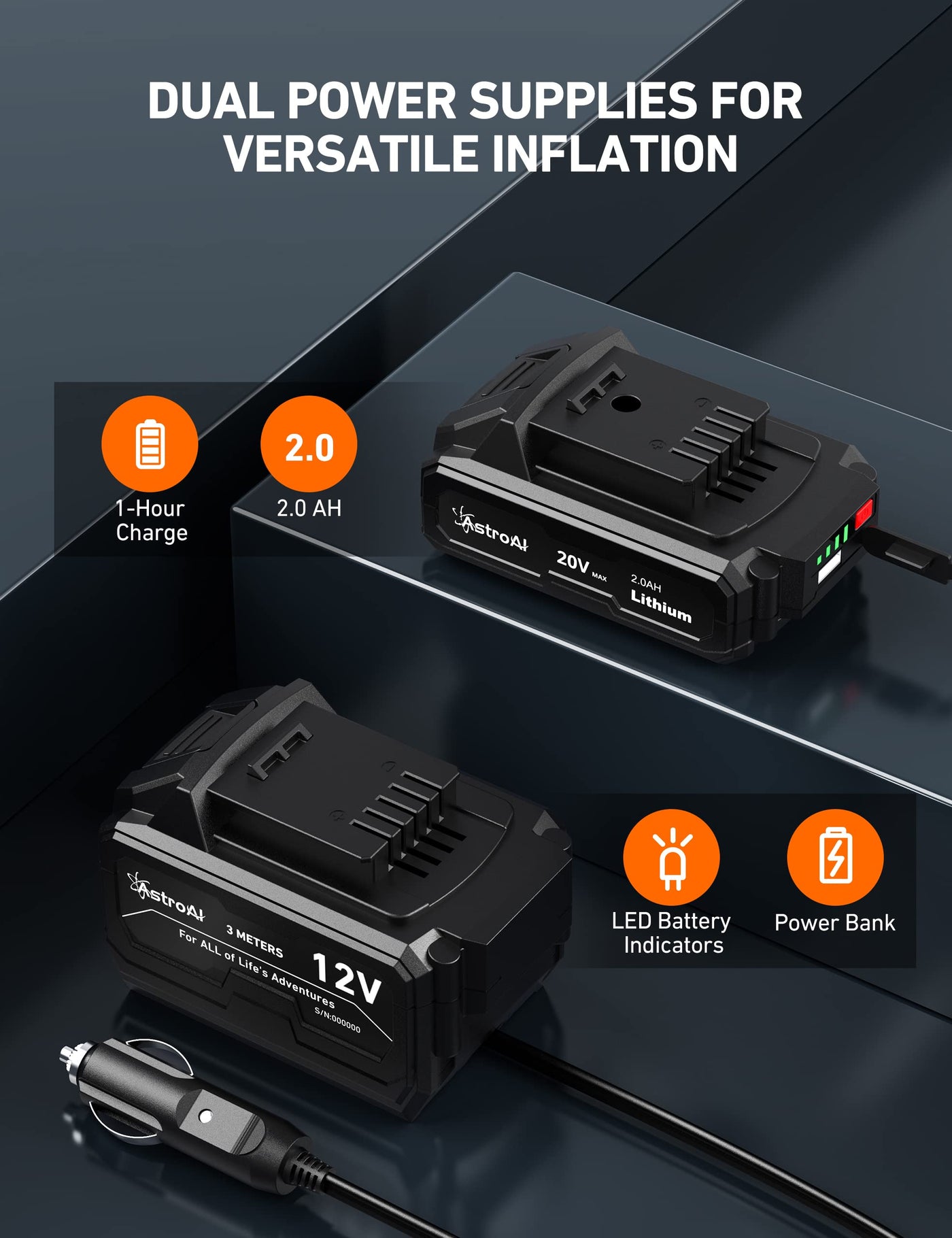 Q: What power sources can I use with this air compressor?A: This air compressor offers dual power supply options: a DC 12V car power adapter and a 20V rechargeable lithium battery, ensuring convenience during travel.