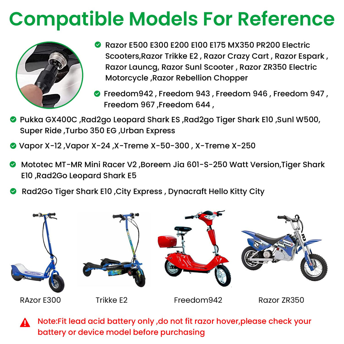 ?Product Parameters?: Input: Ac 100-240V ~ 50/60Hz 0.5A Max, Output: Dc 24V 1.5A, Power: 36W.?Power Light ?: Auspow Charger Red Light Means The Scooter Is Charging, Green Light Means The Battery Is Fully Charged.?Compatible Products?: 24V 1.5A Power Adapter Compatible With Razor E225 E200 E125 E150 E175 E500 E325 E300 Scooter, Mini Chopper, Espark, Eglow, Trikke E2, Razor Part, Razor Pocket Mod, Razor Mx350# W13112099014, Etc. Outlet: 3-Plugs ; Connector Size: 3-Prong Inline Female. Please Note: Did Not Work For Hoverboard.?Security?: Special Design And High Quality Materials Ensure That The Adapter Is Kept In Low Temperature To Charge Safely, And Its Low Energy Consumption Conform To The Us Energy Star Vi.Over-Voltage And Short Circuit Protection, Stable Current And Voltage Output, Give You Scooter Multiple Protection.