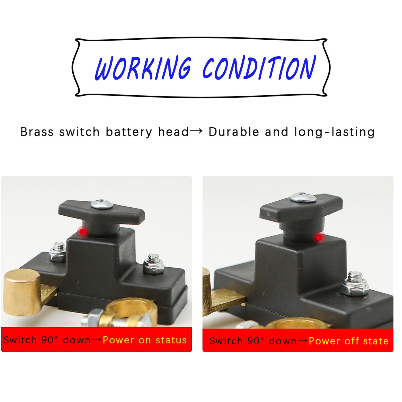 The battery disconnect switch is suitable for 12V/24V 250/1000 ampere batteries and is suitable for most cars,boats,RV,etc. The battery disconnect switch is particularly suitable for vehicles that have been parked for a long time or for those infrequently used cars.It can effectively prevent the battery from running out of power,extend the battery's service life,and reduce the standby power consumption of the vehicle's electrical system. Easy to install,simply install the power cut-off switch at the negative pole of the battery,connect it to the battery,and then rotate the switch to cut off or restore the power. This is a very practical and safe tool. The power cut-off switch can also prevent current leakage or short circuit,avoiding problems such as natural battery discharge or electrical system abnormalities when not in use for a long time.