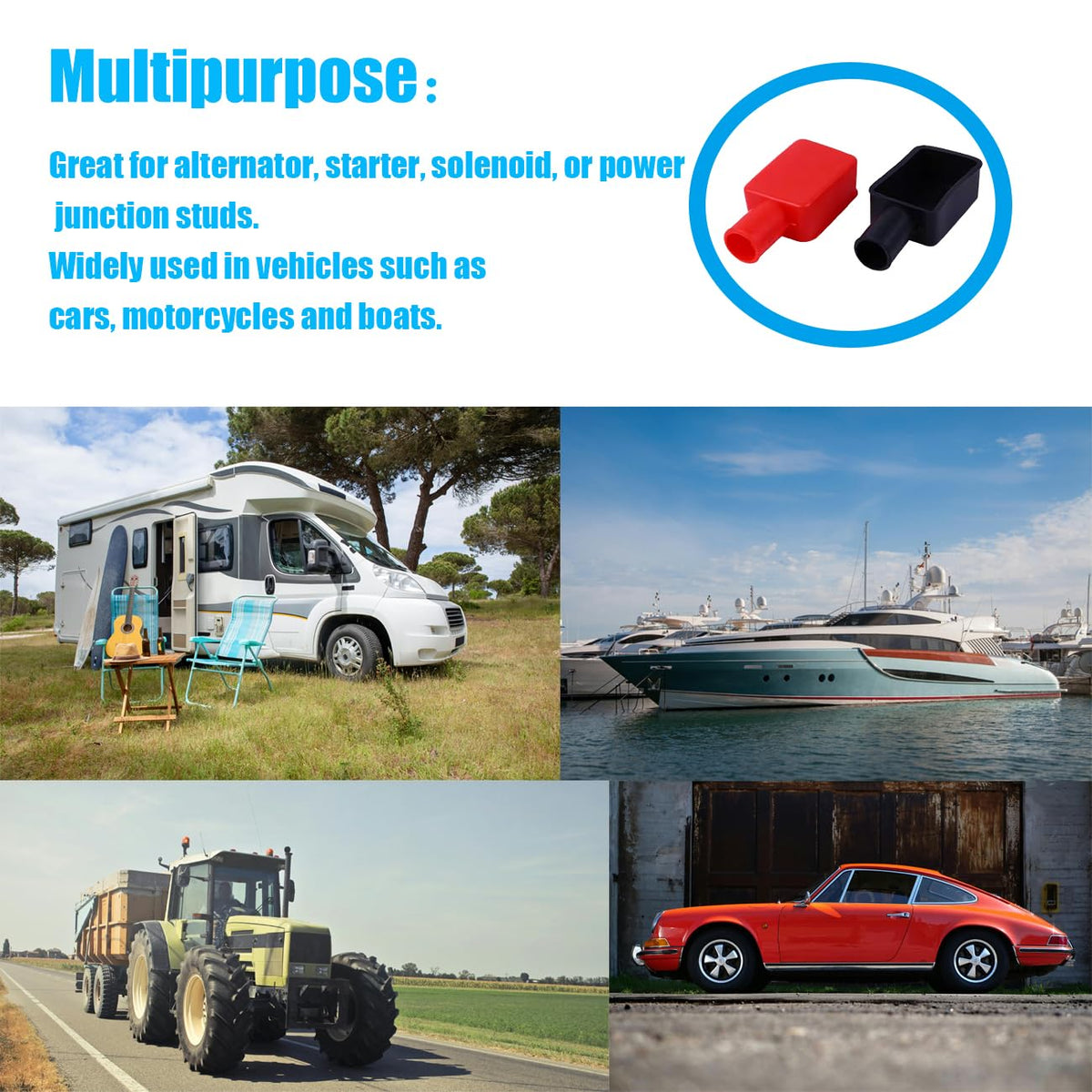 Keep your battery connections safe with these battery terminal covers. Red for (+), black for (-) - impossible to mix up. Made of flexible rubber that withstands summer heat and winter cold. Why These Battery Terminal Covers Work Better: ?? All-Season Shield - Blocks water, road salt, and dust ?? Universal Fit - Fits most battery terminal types on cars, trucks, ATVs, and RVs ?? 5-Second Install - Battery terminal cover installation needs no tools, just push and snap ?? Clean Look - Hides corrosion for a professional finish What's Included: 6 Battery terminal covers (3 Red + 3 Black) Size: Fits most standard battery terminals Perfect For: - Daily drivers & weekend project cars - Motorcycle enthusiasts - RV owners & boaters Pro Tip: Rub a little Vaseline on terminals before installing battery terminal covers for extra protection ? Makes battery terminal maintenance easier ? Keeps battery terminals looking new