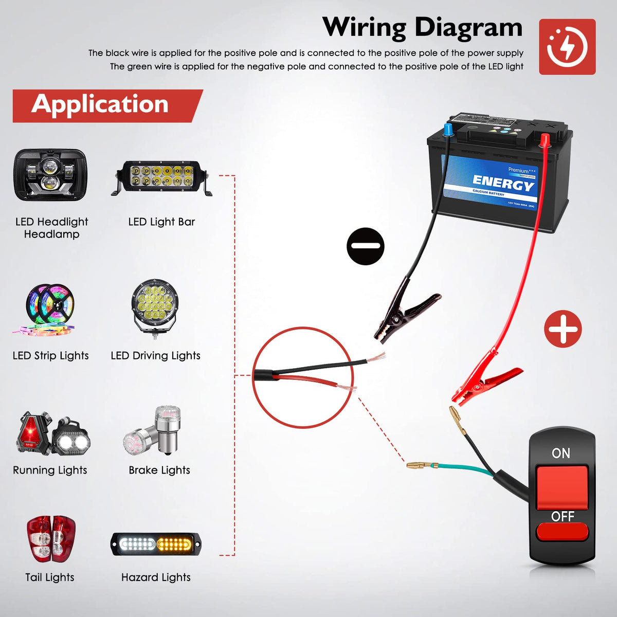 Easy Set Up The Black Wire Is Applied For The Positive Pole And Is Connected To The Positive Pole Of The Power Supply. The Green Wire Is Applied For The Negative Pole And Connected To The Positive Pole Of The Led Light.