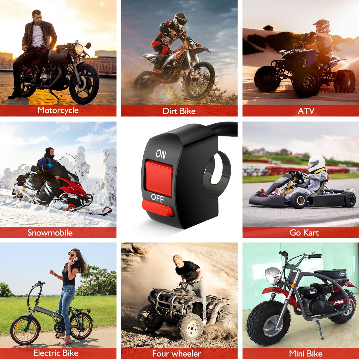 Q: What types of vehicles is the BELINOUS 7/8'' Handlebar On/Off Switch compatible with?A: The BELINOUS 7/8'' Handlebar On/Off Switch is compatible with a wide range of vehicles including motorcycles, dirt bikes, ATVs, four wheelers, mini bikes, electric bikes (ebikes), go-carts, snowmobiles, and motorized bicycles.