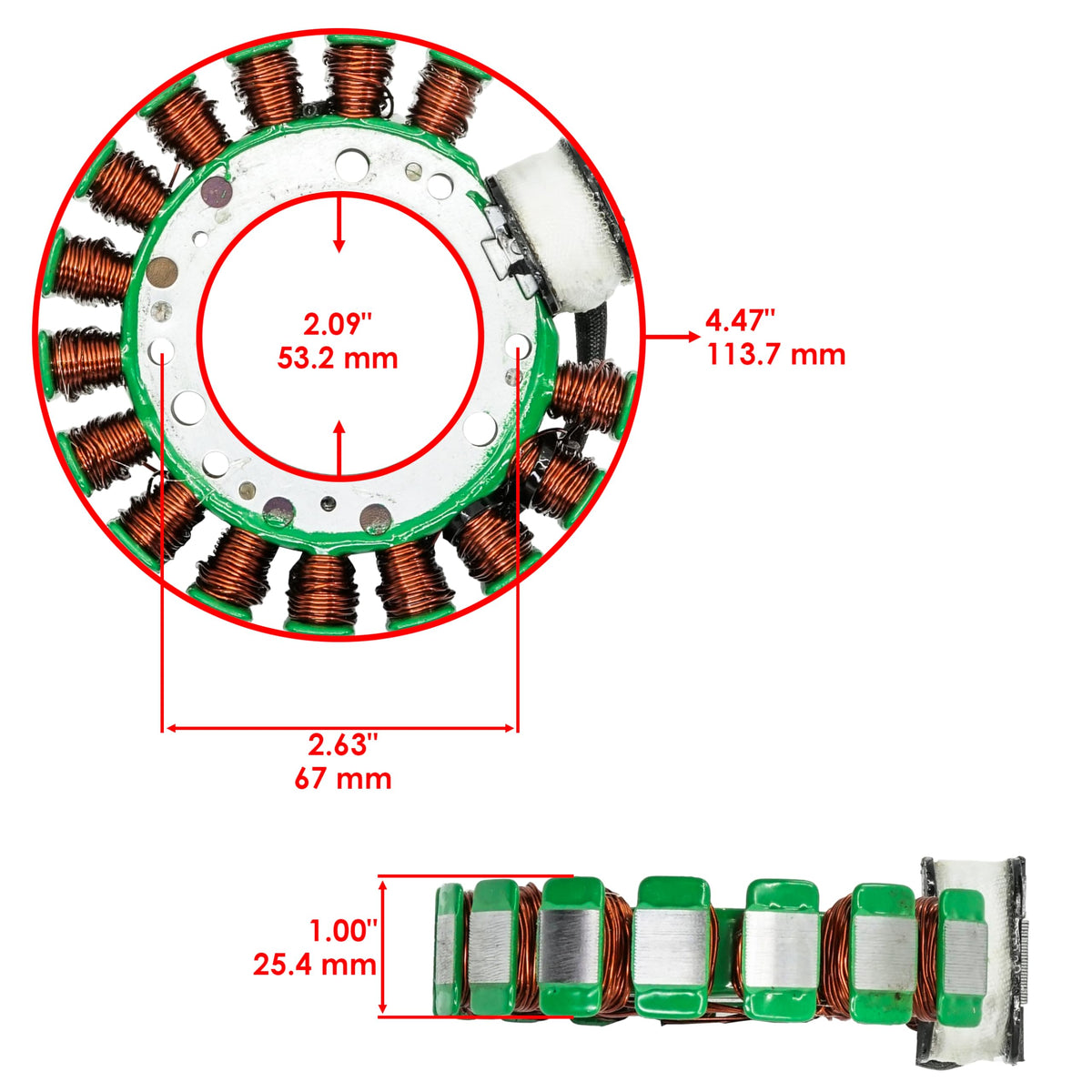 Q: What are the dimensions of the Caltric Stator?A: The dimensions of the Caltric Stator are as follows: Length - 114.5 mm, Width - 114.5 mm, Height - 15 mm, and it weighs approximately 2.3 lbs.