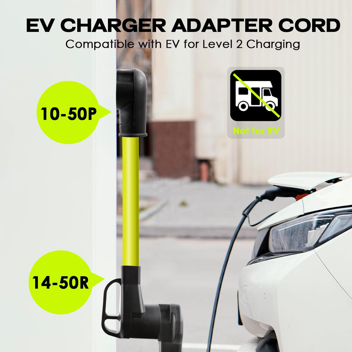 Q: What types of EVs are compatible with the Campzlly EV Charger Adapter Cord?A: The Campzlly EV Charger Adapter Cord is designed to work with electric vehicles (EVs) that have a NEMA 14-50R inlet. This adapter allows you to connect your EV to a household outlet that has a NEMA 10-50P plug.