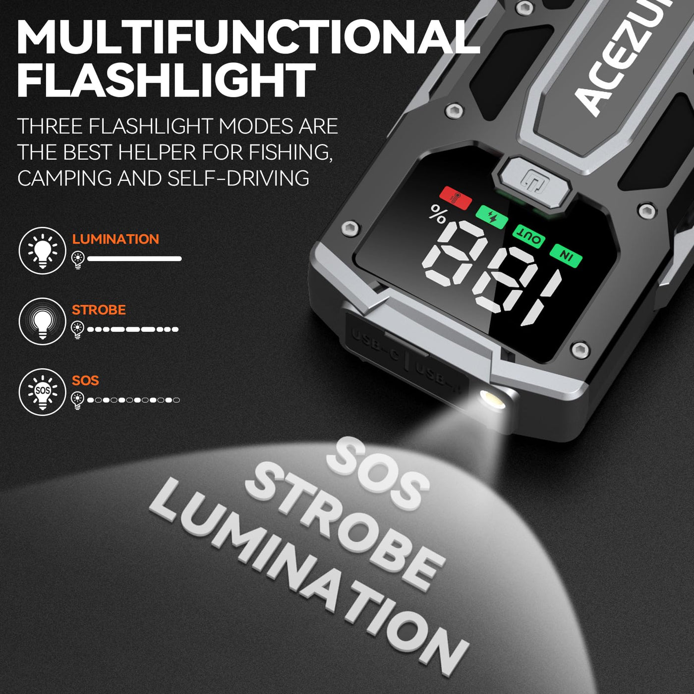 START DEAD BATTERIES--Driven by a 3000A peak current, the battery jump starter battery pack can easily restart 12V dead vehicles up to 7.0 gas/5.5L diesel engines in seconds even at -4?~140. Support more than 1000+ recharge cycles and easier than asking help from others or roadside service. | VISIBLE LED DISPLAY - Compared with traditional portable jump starters with indicators only, ACEZUK visible portable car jump starter clearly displays all the information you need. When you have drained batteries on a road trip, you don't have to guess by the indicators anxiously or wait hours for AAA/someone for help on desolated interstates. Just follow the instructive steps on the LED display to save yourself clearer and easier! | PORTABLE POWER BANK - ACEZUK Lithium jump starter is integrated with 3 functions. It's a car jump starter, portable power bank, compass, LED emergency torch with 3 modes (flashlight, fast flashing, slow flashing, ).It is equipped with 2 ports. | ADVANCED PROTECTION TECHNOLOGY - The portable Lithium jump starter car battery cables are constructed with all-metal clamps to prevent breakage caused by long-term use. And it also has 8 protections, including reverse polarity, reverse connection, over current, over voltage, overload, over-charge, over-discharge, short circuit. All the protections make yourself and your loved ones safe. | ?WHAT YOU GET & WARRANTY?ACEZUK jump pack (1* portable jump starter, 1* smart jumper cables, 1* USB-C charging cable, 1* user manual. We offer 2-YEAR FREE Warranty, Lifetime Technical Support, and 7/24 Customer Service.