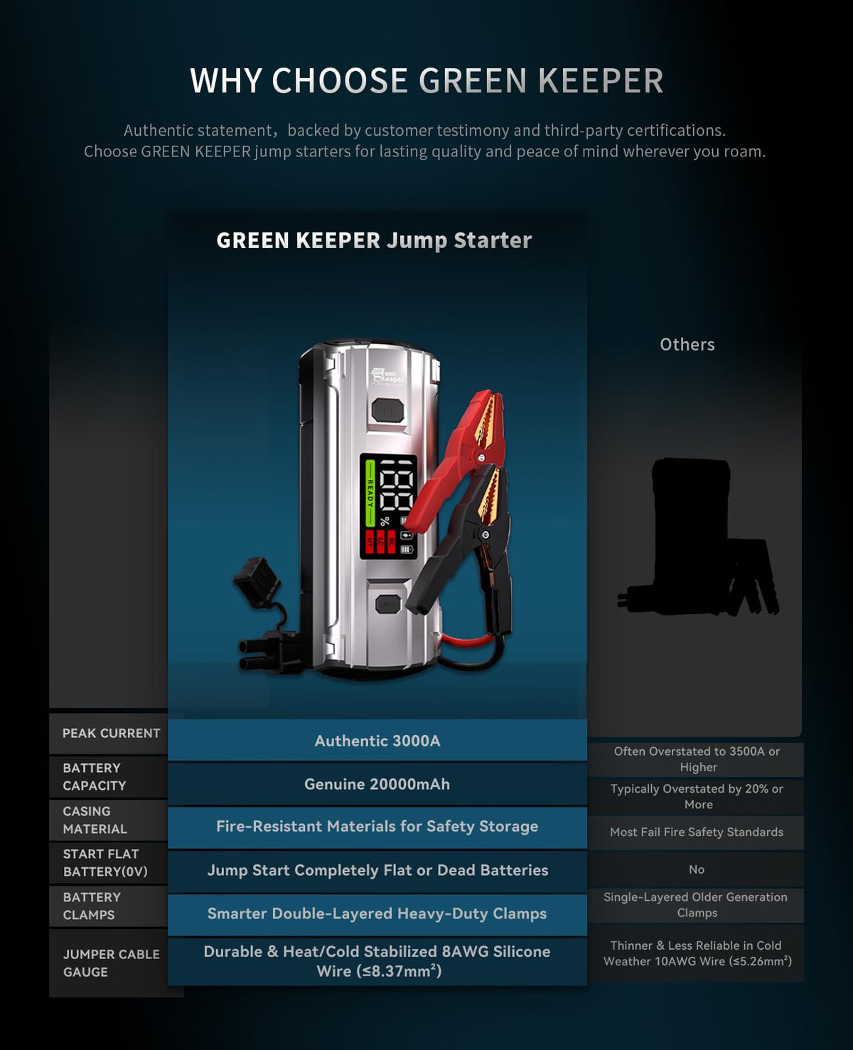 Product Name: Green Keeper GK-J1203 Portable Car Jump Starter Peak Current: 3000A Surge, 1500A Starting Current Applicable Engine Types: Suitable for up to 8.0L Gas & 8.0L Diesel Engines Power Bank Functionality: Equipped with PD65W Type-C charging for smartphones, tablets, and other devices Built-In Air Compressor: Versatile tool for inflating tires, sports equipment, and more Safety Features: Comprehensive protection including low voltage, overcharge, over discharge, and reverse polarity Warranty: 18-Month Warranty Customer Support: 24-Hour Customer Service Design: Ergonomic, compact, and durable, ideal for all weather conditions Dimensions: 226.7 x 90 x 54.4mm Weight: 1.69 kg Package Contents: Green Keeper GK-J1203 Jump Starter, EC5 Jumper Cables, USB Charging Cable, Cigarette Lighter Adapter, Storage Bag, User Manual