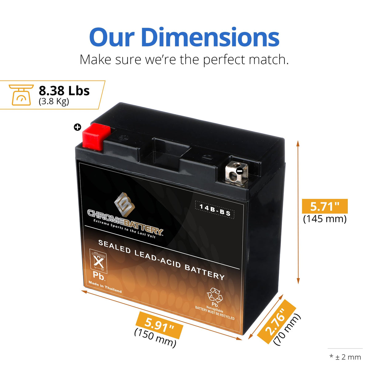 The YT14B-BS Chrome Battery sealed AGM battery is the precision power solution for motorcycles, ATVs, UTVs, jet skis, snowmobiles, scooters, and more. Built with lead-calcium alloy and AGM (Absorbed Glass Mat) technology, this battery delivers maintenance-free, high-performance reliability. The YT14B BS AGM battery is rigorously tested to ensure safety, OEM compatibility, and optimal performance in extreme conditions. Designed with vibration resistance, high cranking amps, and a low self-discharge rate, the 14B BS comes fully charged and ready for immediate use. Choose Chrome Battery for trusted durability and exceptional power.
