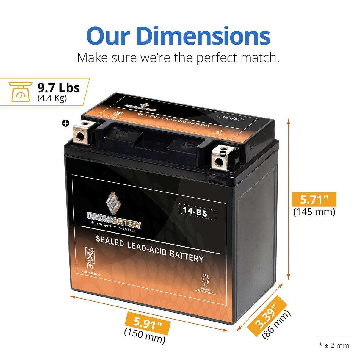 The YTX14-BS Chrome Battery sealed AGM battery is the precision power solution for motorcycles, ATVs, UTVs, jet skis, snowmobiles, scooters, and more. Built with lead-calcium alloy and AGM (Absorbed Glass Mat) technology, this battery delivers maintenance-free, high-performance reliability. The YTX14 BS AGM battery is rigorously tested to ensure safety, OEM compatibility, and optimal performance in extreme conditions. Designed with vibration resistance, high cranking amps, and a low self-discharge rate, the 14 BS comes fully charged and ready for immediate use. Choose Chrome Battery for trusted durability and exceptional power.