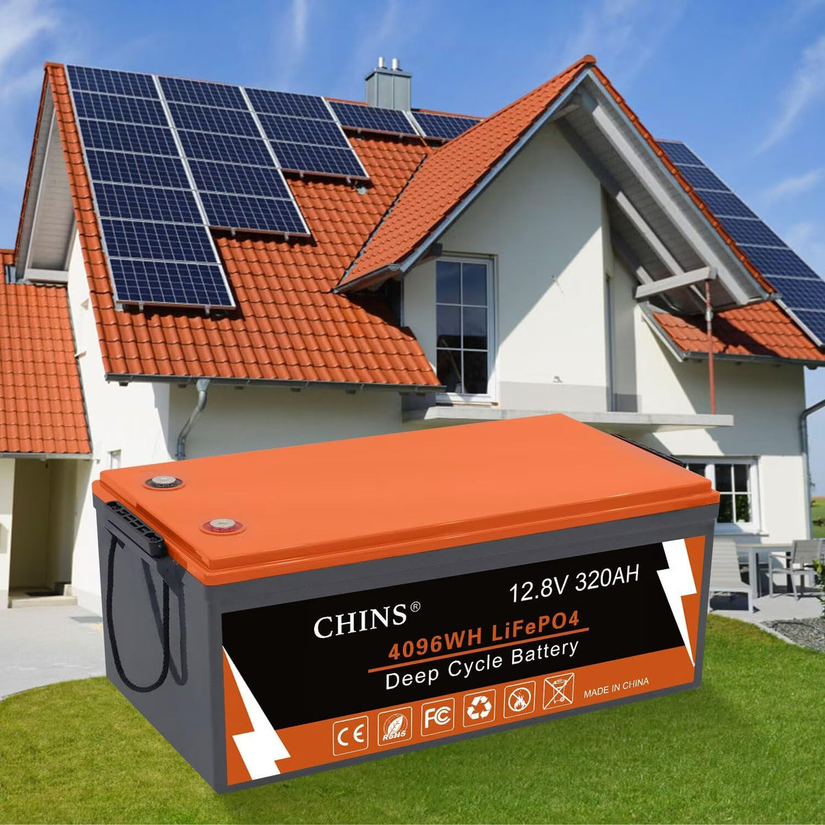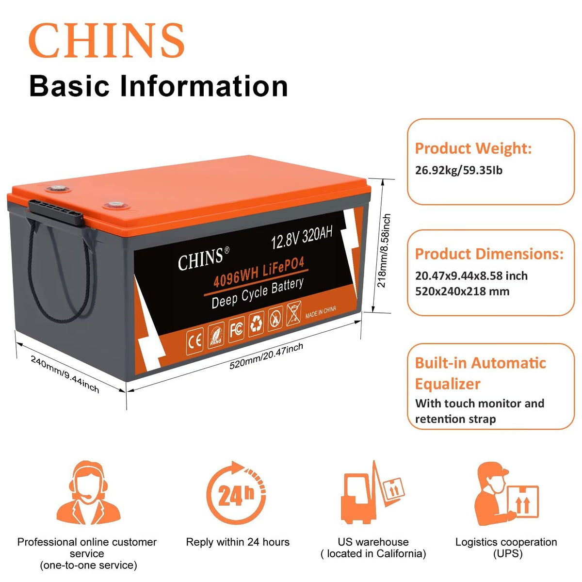About CHINS Battery CHINS has its own factory, are mainly engaged in LiFePO4 and lithium-ion battery business, which is very suitable for RV, Caravan, Solar, Marine, Home Storage and Off-Grid. CHINSs team keep strive to maintain a green life on the way of continuing to explore the new energry, in order to provide a better low-carbon life for people. CHINS is equipped with the most advanced R&D team and equipment, and our products have obtained CE, ROHS, WEEE and PSE quality system certification. We also set up our own warehouse in California, USA.Specifications Rated Capacity (0.2C): 320Ah / 4096Wh Cycle life: 2000+ cycles at 80% discharge depth Rated voltage: 12.8V Charge voltage: 14.2V - 14.6V Depth of Discharge (DoD): 100% Standard charge current: 60A Charging time: Approximately 7 hours Max continuous charge current: 110A Max continuous discharge current: 250A Peak discharge current: 750A (Duration: less than 3 seconds) Operating temperatures: Charge 0C~50C(32F~122F), Discharge -20C~60C(-4F~140F), Storage -20C~50C(-4F~122F)Impedance: = 6mOBrand: CHINSSize: 20.47 x 10.59 x 8.66 inches Color: Black, Orange.