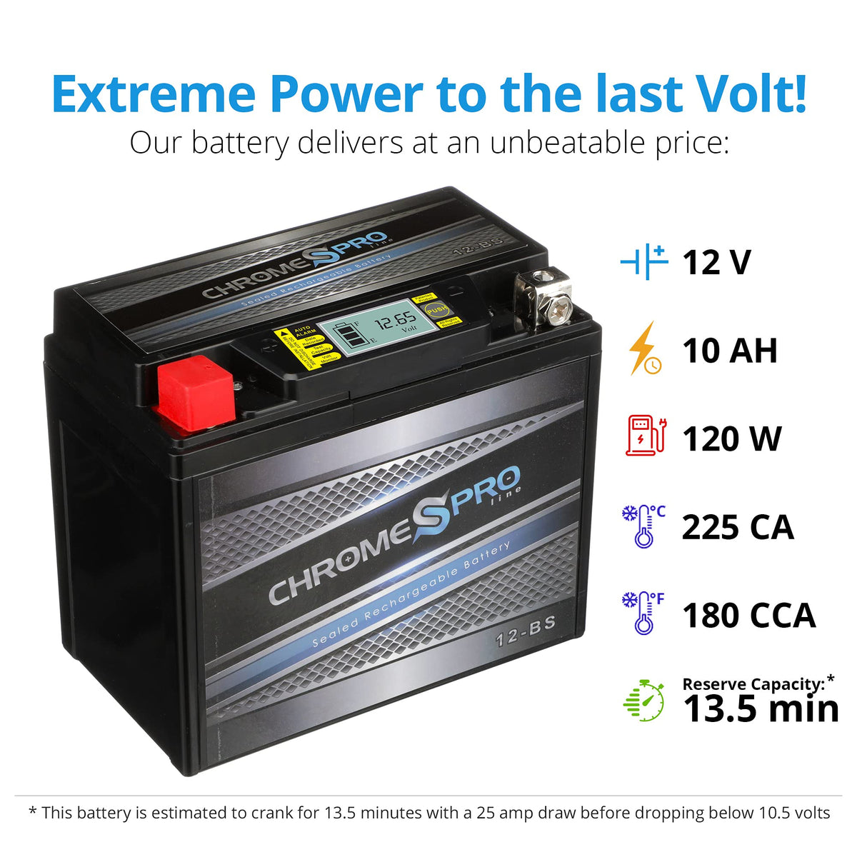 The YTX12-BS Chrome Pro iGel battery is the ultimate power source for motorcycles, ATVs, UTVs, jet skis, snowmobiles, scooters, dirt bikes, and more. Featuring a built-in LED display, this YTX12 BS iGel battery lets you effortlessly monitor performance, voltage, and temperature at a glance. Designed with AGM technology, gel electrolytes, the 12 BS iGel battery delivers maintenance-free, spill-proof reliability, and superior vibration resistance for unmatched durability. Fully charged and ready to install, the 12-BS battery fits a wide range of OEM applications, providing dependable power in extreme conditions. Trust Chrome Pro for innovative design, peak performance, and long-lasting power.