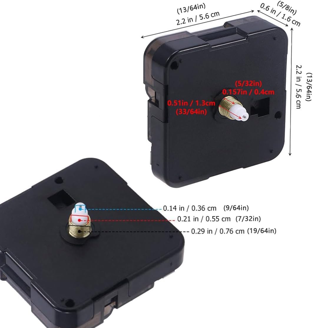 Q: What is the size of the Clock Mechanism Replacement?A: The Clock Mechanism Replacement measures approximately 2.2 x 2.2 x 0.6 inches or 5.6 x 5.6 x 1.6 cm, making it a compact option for various wall clock designs.