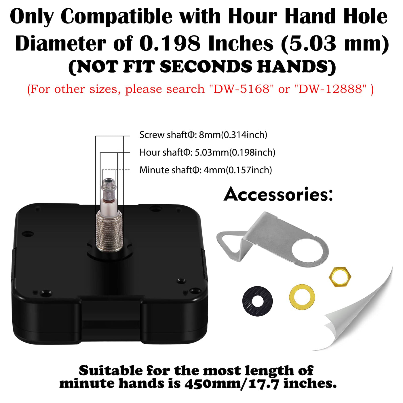 Q: What type of clock hands can I use with this movement?A: This clock movement supports long minute and hour hands. The hour hand must fit a circular hole with a diameter of 5.03 mm (0.198 inches), while the minute hand requires a rectangular hole with a height of 4mm (0.157 inches). Please ensure your clock hands meet these specifications.