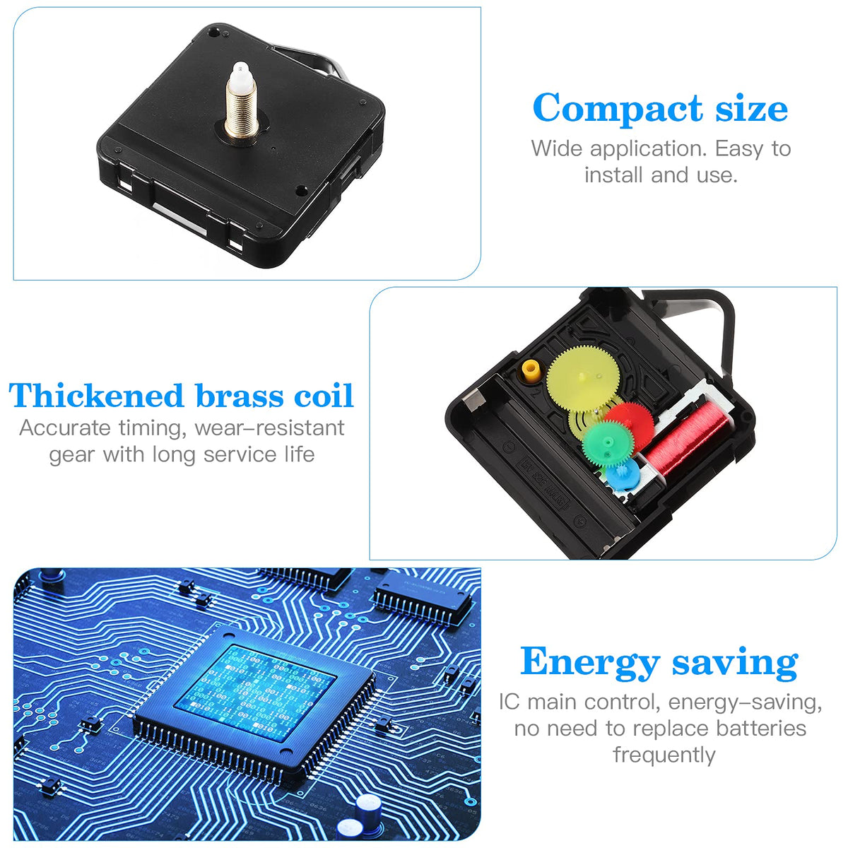 Q: What features make this clock movement different from others?A: This clock movement features a smooth sweep motion, allowing for continuous movement without ticking noise, making it ideal for a quiet environment. Additionally, its elegant design suits various clock styles, enhancing your decor.