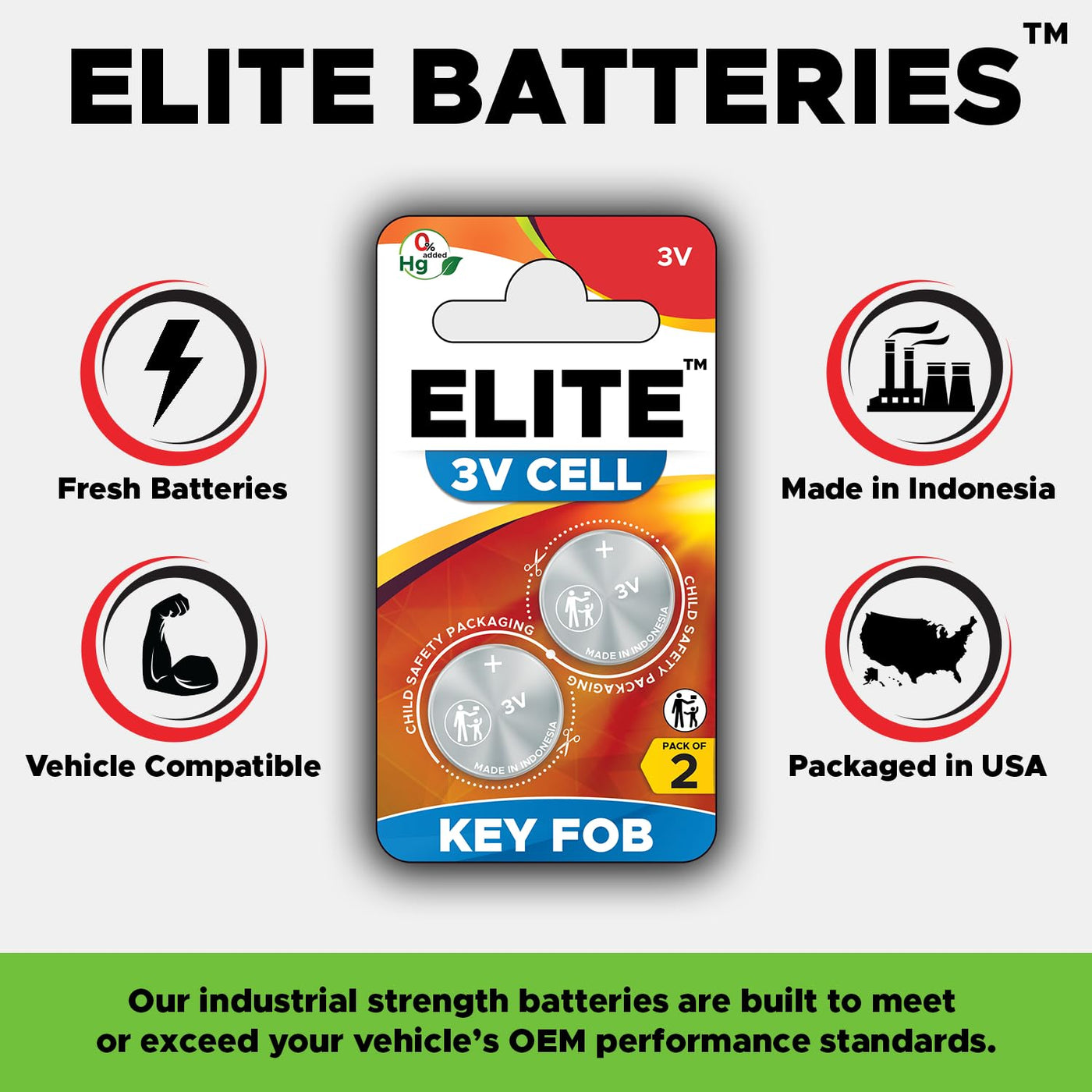Our Premium-branded, industrial strength batteries are sourced from and manufactured by the same OEM factory - 100% compatible with Nissan. These are the same batteries your dealer uses, at a fraction of the cost! ELITE USA COMPANY Elite Batteries are distributed out of Miami and Jacksonville, Florida. INDUSTRIAL STRENGTH Elite Batteries are the same quality used by your car manufacturer. 2X THE POWER & VALUE 2-for-1 battery packs-more power, same price! You can't beat that. EASY TO INSTALL YOURSELF Read below for easy instructions on how to replace yourself. Elite Batteries are compatible with smart key fob for these Nissan models: (key fob must match compatibility guide) ? Nissan Altima (2007-2024) ? Nissan Ariya (2022-2024) ? Nissan Armada (2007-2024) ? Nissan Cube (2009-2014) ? Nissan Frontier (2020-2024) ? Nissan GT-R (2009-2024) ? Nissan Juke (2011-2017) ? Nissan Kicks (2018-2024) ? Nissan Leaf (2011-2024) ? Nissan Maxima (2007-2024) ? Nissan Murano (2003-2024) ? Nissan Pathfinder (2007-2024) ? Nissan Quest (2011-2017) ? Nissan Rogue (2008-2024) ? Nissan Rogue Select (2014-2015) ? Nissan Rogue Sport (2017-2024) ? Nissan Sentra (2007-2024) ? Nissan Titan (2016-2024) ? Nissan Titan XD (2016-2024) ? Nissan Versa (2007-2024) ? Nissan X-Trail (2022-2024) ? Nissan 370Z (2009-2020) ? Nissan 400Z (2023-2024) Not compatible with these models: ? Nissan Altra ? Nissan NV Cargo ? Nissan NV Passenger ? Nissan NV200 ? Nissan Xterra ? Nissan 200SX ? Nissan 240SX ? Nissan 300ZX ? Nissan 350Z Steps to replace your key fob battery: If your key fob has a mechanical key, slide the release button or latch to remove it. If no mechanical key, skip this step. Use a flathead screwdriver or coin to pry open the key fob at the seam. Lift out the old battery. Insert the new battery with the positive (+) side facing up. Snap the key fob halves back together. If you removed a mechanical key, reinsert it. Press the lock and unlock buttons to verify your key fob is working. Elite Batteries give you 2x the value with 2 twin-packs. Why settle for less? Elite Batteries gives you twice the power for the same price. Invest in Elite, with Premium-branded, industrial-strength key fob battery replacements today!