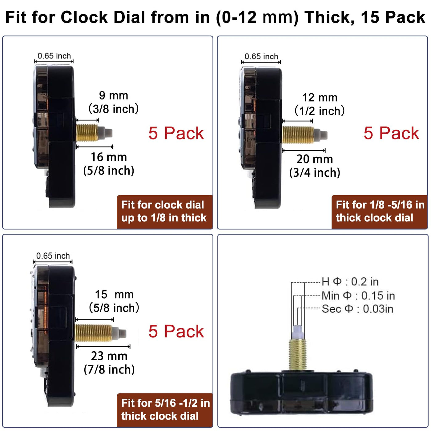 Q: What sizes of clock shafts does the EMOON Clock Mechanism Replacement Kit include?A: The EMOON Clock Mechanism Replacement Kit features three shaft sizes with total lengths of 7/8 in, 3/4 in, and 5/8 in, making it compatible with clock dials up to 1/2 in (12 mm) thick.