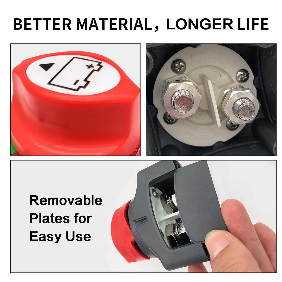 Q: Is this battery switch waterproof and durable for outdoor use?A: Yes, the GOGONFLY Battery Disconnect Switch features a fully enclosed design made of heavy-duty ABS plastic housing and copper tin plating. This construction ensures it is waterproof and sturdy, protecting it from dirt, corrosion, and rain.