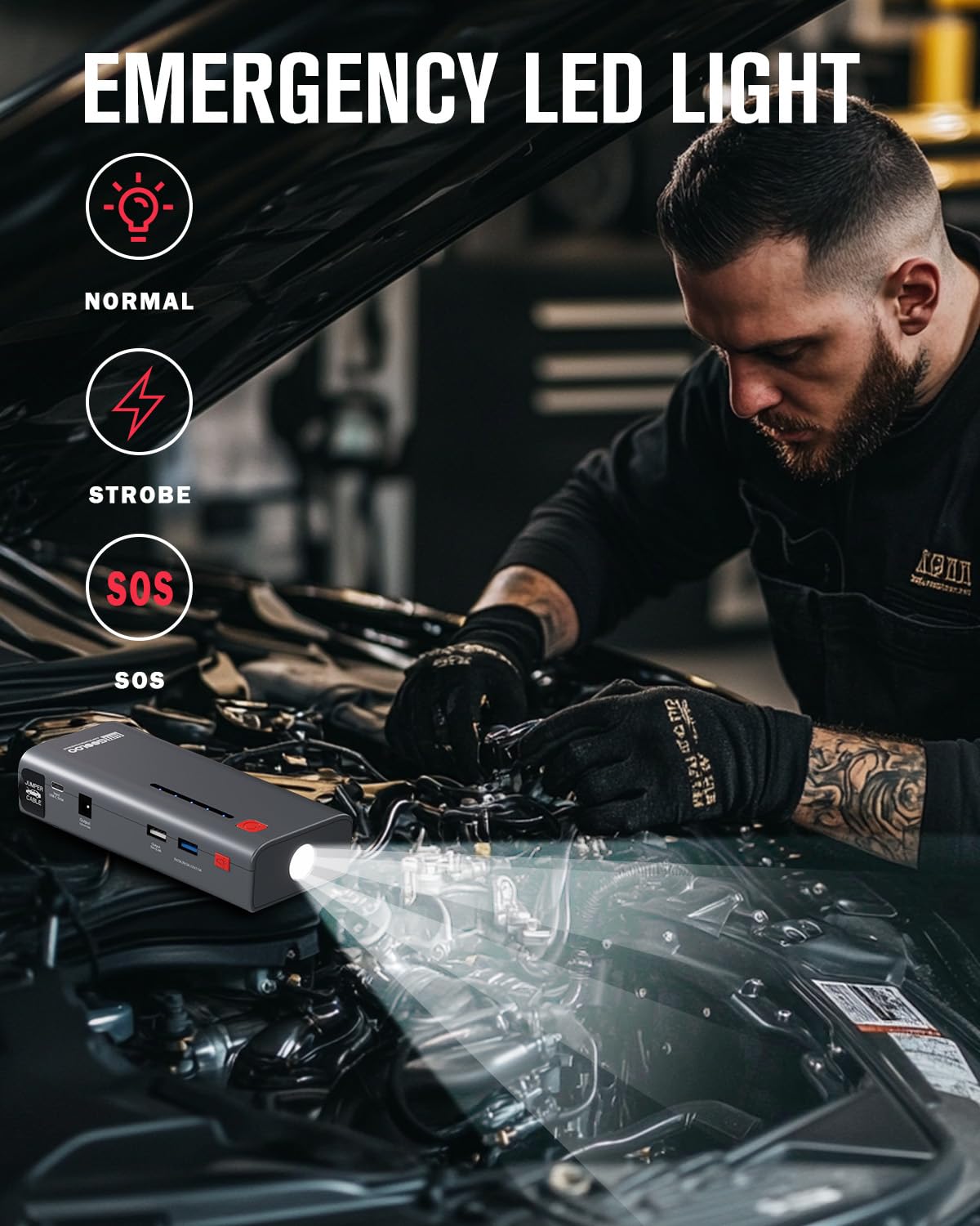 EMERGENCY LIFE SAVER: The GOOLOO portable car battery jump starter power pack with 3000A peak current amps, the car jump starter can easily jump start 12V vehicles up to 8.5L gas or 6.0L diesel. What 's more, we have a ''Boost '' feature that can wake up a completely dead vehicle. It is fully charged in 3-4 hours and can stand by for 24 months. | SAFE AND EASY TO USE: The smart jumper cable features 10 kinds of advanced safety technologies,including over-current protection, overload protection, over-voltage protection, over-charge protection and high-temperature protection to ensure safety for the user. Besides, the jump starter battery pack has good quality to work well in extreme temperature (-4