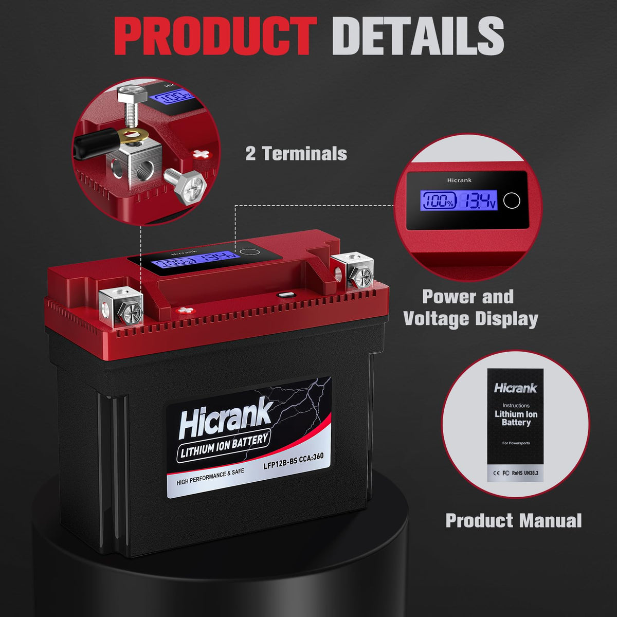 Hicrank YT12B-BS Lithium 12V 6Ah 360CCA LiFePO4 Motorcycle Battery, Powersports Battery for Scooter, ATV, UTV, Jet Ski, Personal