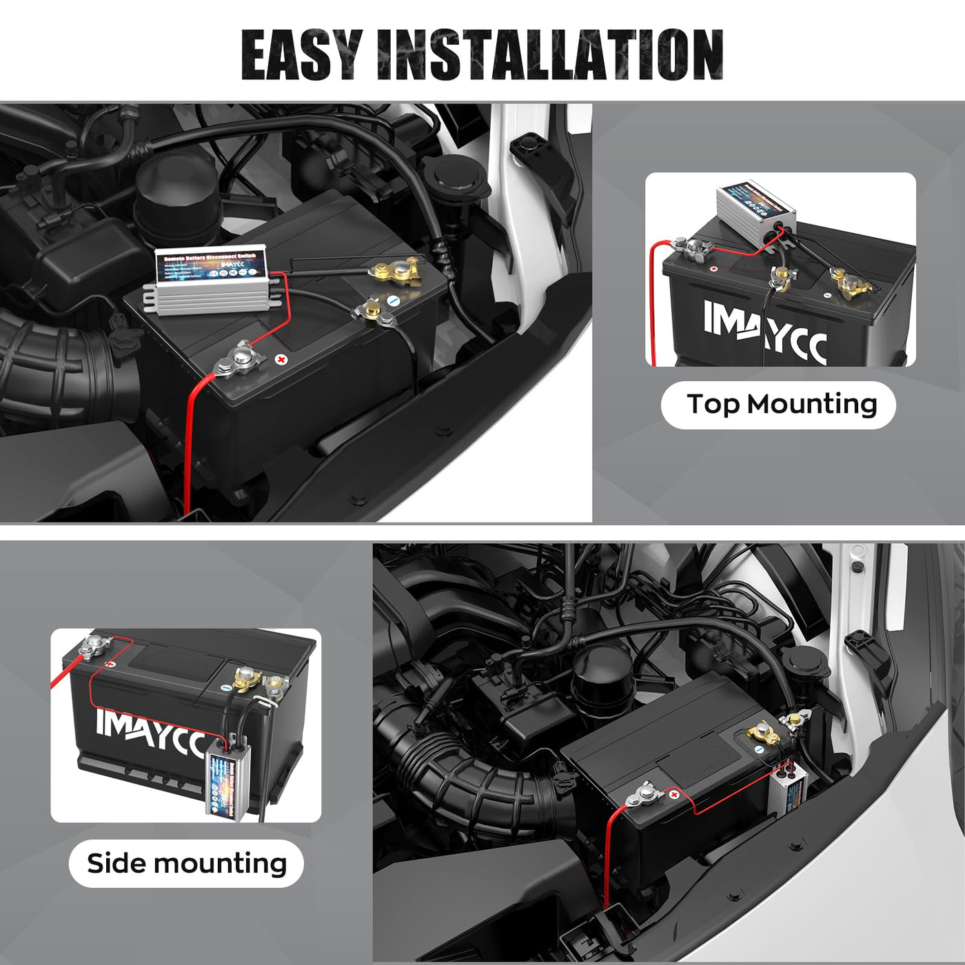 ???How Battery Switch work? This Kill switch can avoid car battery to drain due to long-term parking, line aging and forgetting to turn off the light. It can maximize the storage of car battery power, effectively protecting and extending lifespan. | ???Smart battery disconnect Switch?When battery voltage is below 11.8V, the remote kill switch automatically cuts off power after 120s to save electricity ; when the voltage is higher than 13.2V When Driving, the remote control will fail. | ???Adjustable mounting options?This battery switch can be connected to the negative or positive terminal of the battery, please check the engine compartment for a suitable mounting position before installation and adjust the mounting position. | ???Remote Control & Low power consumption?Remote control range : 100m ; standby power consumption: 2mA ; Operating Temperature: -22?~194? ; rated current: 120A ; rated voltage: 12V, power-off threshold: 11.8V