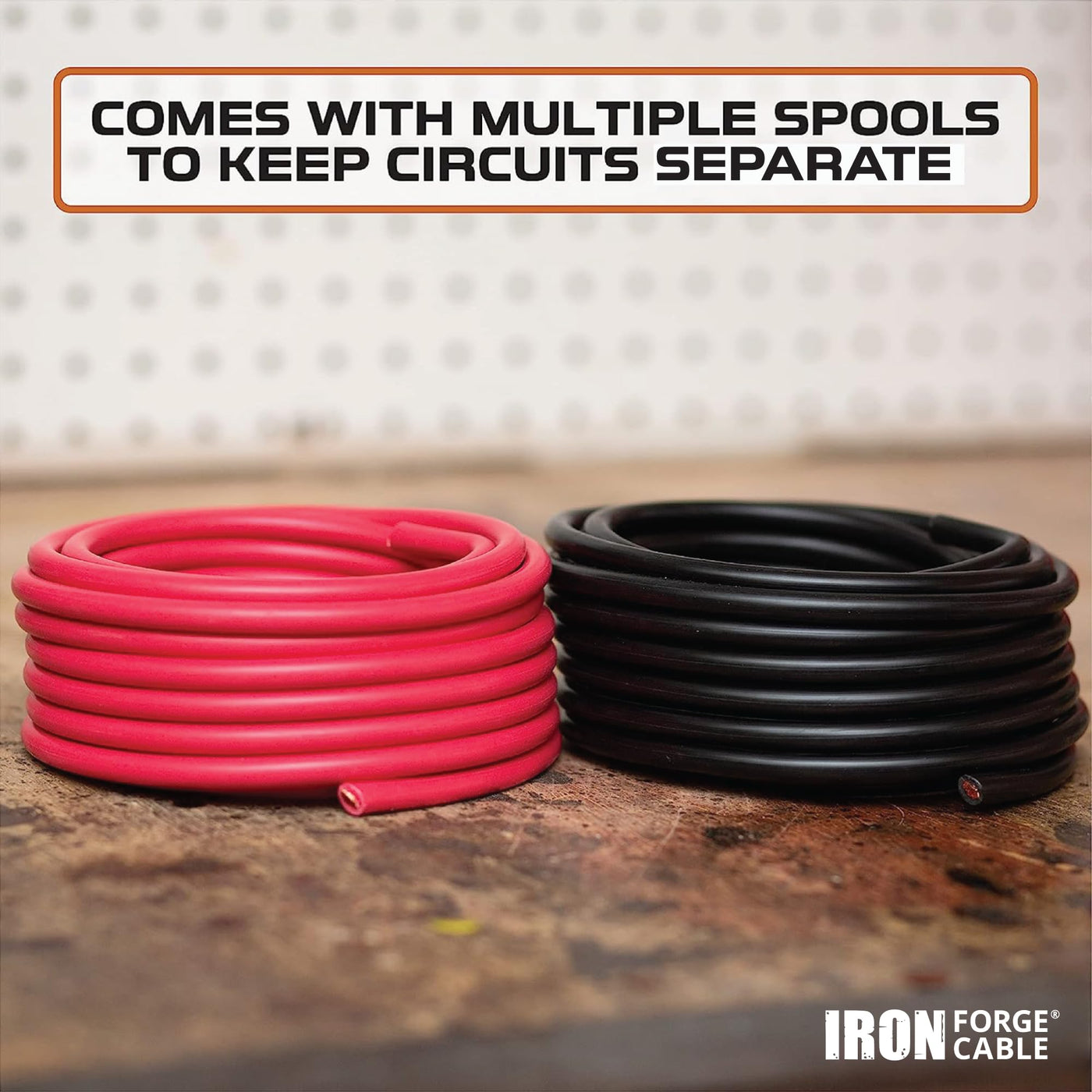 Q: How long is each roll of the Iron Forge Cable 4 Gauge Wire?A: Each roll of the Iron Forge Cable 4 Gauge Wire is 10 feet long, providing ample length for various electrical projects.