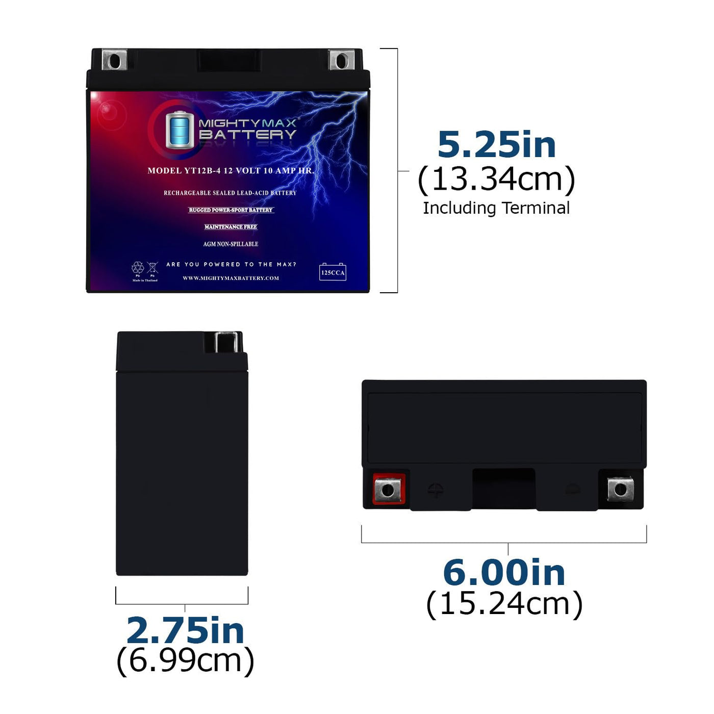 YT12B-4 is a 12V 10AH 125 Cold Cranking Amps (CCA) Sealed Lead Acid (SLA) Battery | Dimensions: 6.00 inches x 2.75 inches x 5.25 inches. Polarity: Positive on left, Negative on right. Listing is for the Battery and Screws only. No wire harness or mounting accessories included. | SLA / AGM spill proof battery has a characteristic of high discharge rate, wide operating temperatures, long service life and deep discharge recover. | Rechargeable battery that can be mounted in any position, resists shocks and vibration. Long lasting high performance in high and low temperatures. | Full One Year Warranty