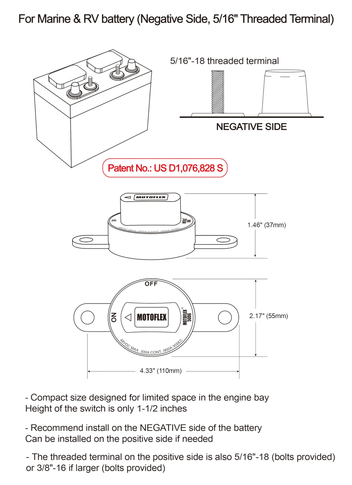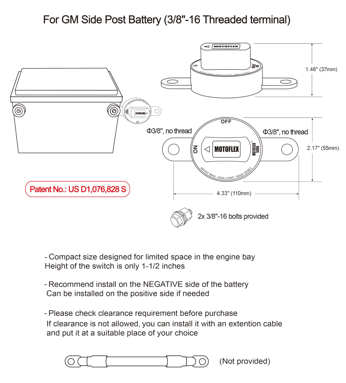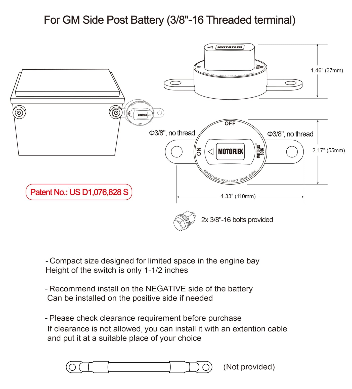 MOTOFLEX Side Post Battery Disconnect Switch for GM Car Truck, Marine RV Battery Switch 12V-48V Power Cut Off High Current 300A/