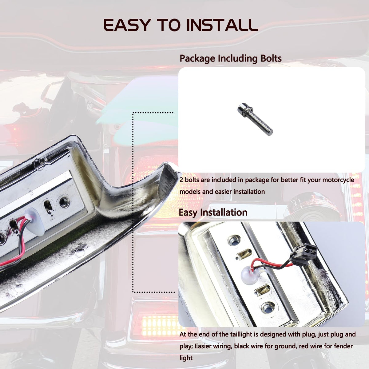 ?Compatibility?Fit harley touring models, such as 1986-2017 FLSTC, 1993-1996 FLSTN and 1980-2008 FLHR, FLHS, FLHT and FLT models, etc. For more suitable models please refer to amazon confirmed fit. | ?3X Brighter Than Halogen Bulbs?Built in high power SMD led chips, 3x brighter lighting output than halogen bulbs, greatly increased your visibility while riding at night, make your driving safer. | ?Sleek & Modern Design? The smoked lens adds a stylish, modern touch to your motorcycle while maintaining clear visibility without weakening the LED lighting. The integrated fender tip trim design perfectly contours to fender tips. | ?Easy to Install?Easy to install, you will need to use the existing plug from your tail light and splice it onto the bare wires that come with the new light. You may need to use your stock wires or add additional wires. Made of high quality ABS plastic, anti-scratch, metal bracket processed with black anodized finish, anti-oxidation, anti-corrosion, prolong the life service time. | ?What You Will Get?1Pcs front smoked fender tip light+ 1pcs rear fender tip light. You are backed by 3- Month since from order purchasing, please contact us if you have any questions. Solutions will be offered once detail is confirmed.