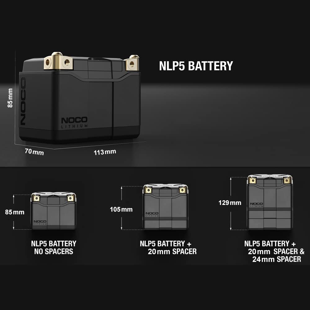 Introducing the NOCO Lithium NLP5 12V Lithium Powersports Battery, a Group 5 battery, rated at 2Ah (25Wh) and 250-amps of starting power. It's better than lead-acid motorcycle batteries in almost every way: no sulfation, no activation, no acid, no maintenance, no water needed, and it comes fully charged and ready to install. It's designed to withstand 50,000 start cycles and 2,000 charge cycles, making it the highest performing and longest-lasting battery for any motorcycle, ATV, UTV, PWC, scooter, or snowmobile. Its internal Battery Management System (BMS) ensures safe and reliable operation without requiring any manual reset of its BMS. And unleash the power of lithium and quickly recharge within minutes - even from 0% to starting with just 5-minutes of charge. Compatible with most powersports brands - Aprilla, BMW, Buell, Ducati, Harley-Davidson, Indian, Triumph, KTM, Argo, Can-Am, Honda, Husqvarna, Kawasaki, Suzuki, Arctic Cat, BRP, Waverunner, Polaris, Vespa - motorcycles, ATVs, UTVs, PWCs, quads, 4 wheelers, jet skis, seadoos, waverunners, scooters, riding lawn mowers, generators and more. Plus, it replaces lead-acid motorcycle models: BTZ4L-BS, BTZ5S, BTZ5L-BS, BTZ7S, BTZ7L-BS, BTZ8V, YTX4L-BS, YTZ5S-BS, YTX5L-BS, YTZ7S, YTZ7L-BS, and YTZ8V. Includes: NLP5 Group 5 2Ah Lithium Powersports Battery, (2) 3-Way Battery Terminals with (4) M6 Hex Screws, (1) Hex Key, (1) Removable Mounting Bracket, (1) 20mm Spacer, (1) 24mm Spacer, User Guide, and a 5-Year Limited Warranty.