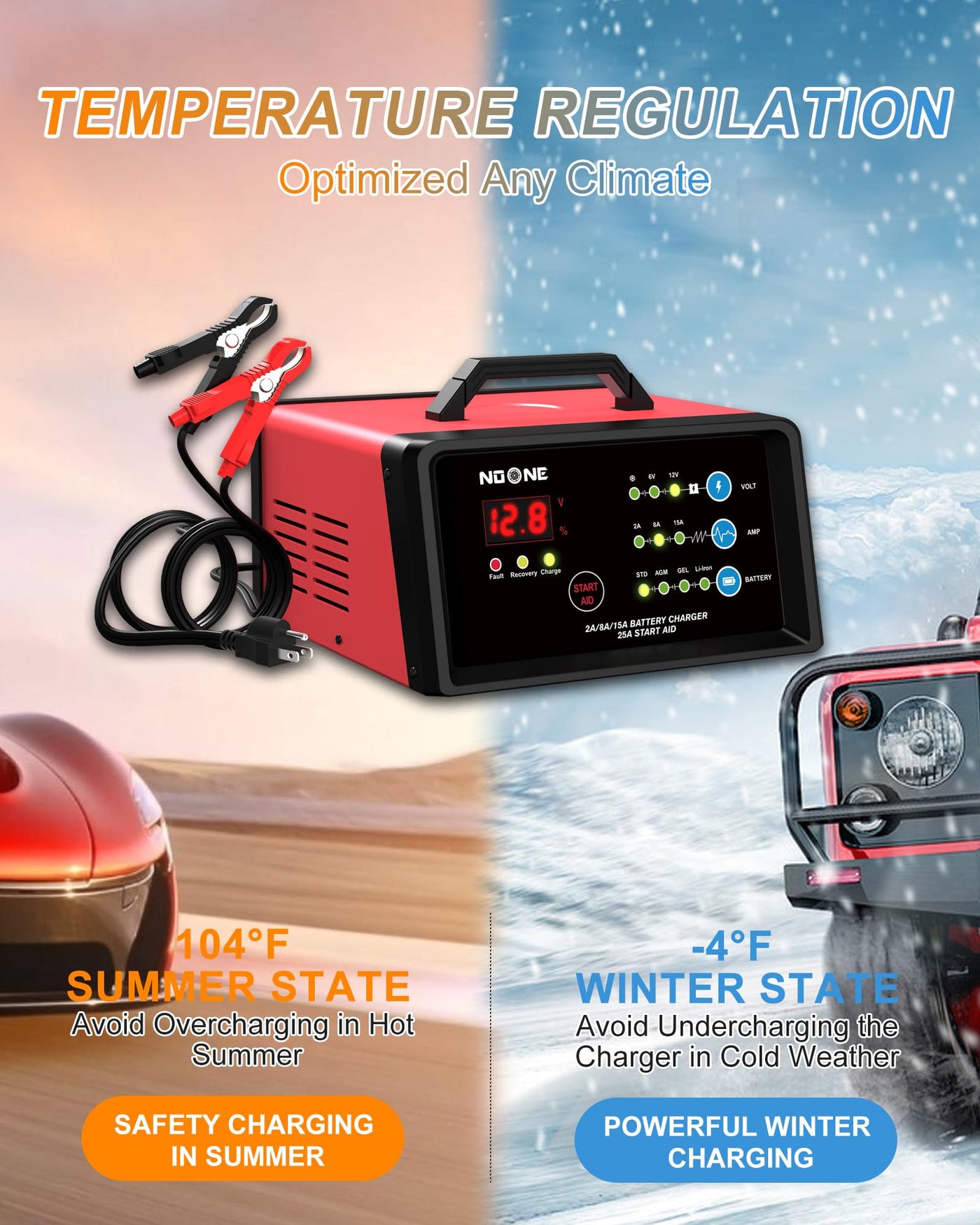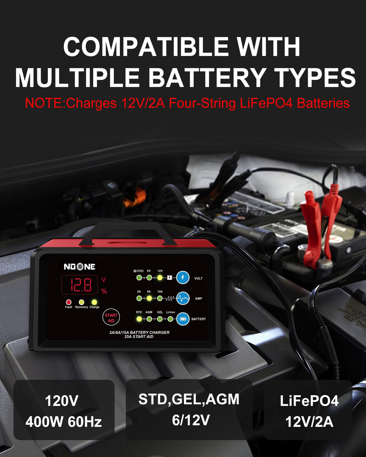 Noone Smart Car Battery Charger: 2/8/15A Battery Chargers 6V/12V Boat Battery Chargers With Engine Start, Metal Shell, Winter Mo